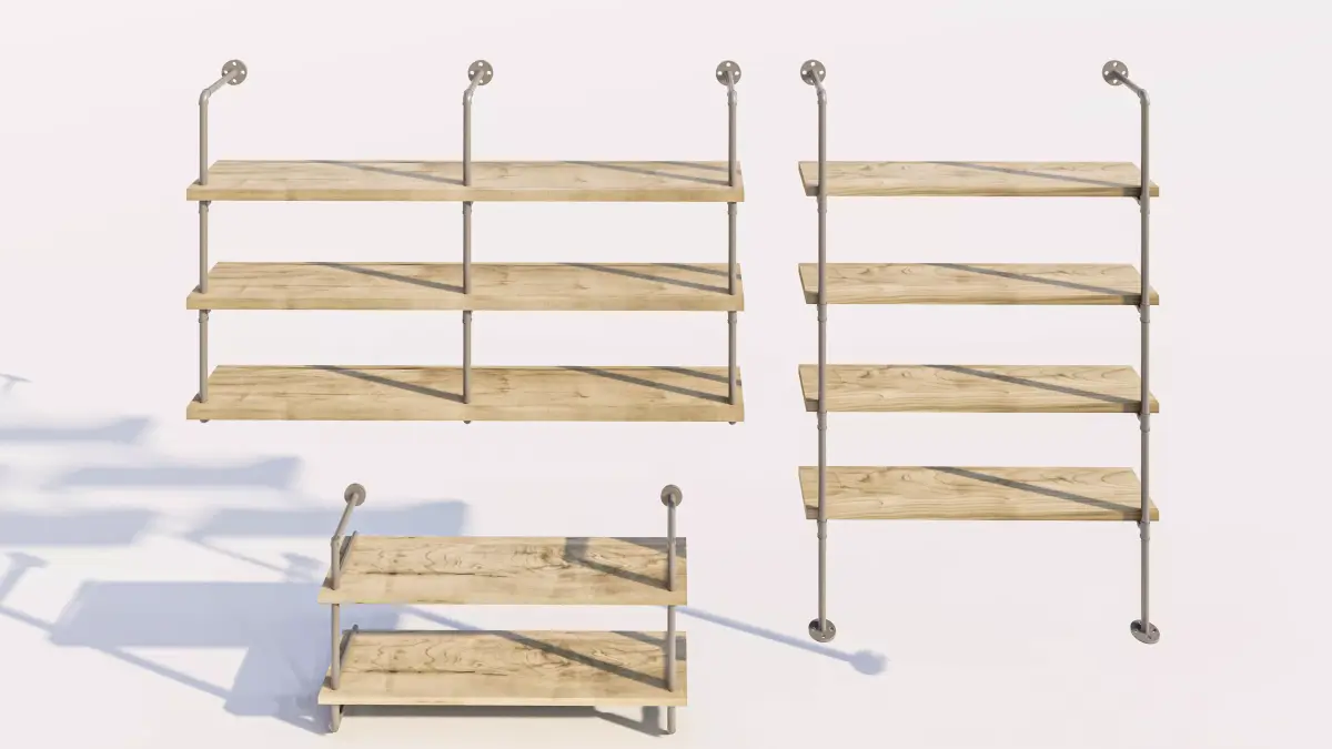 Natural Wood Planking: The shelving surfaces are modeled with high-resolution textures for reclaimed wood, pine, or dark oak, featuring realistic grain and edge detailing.