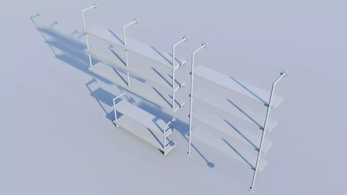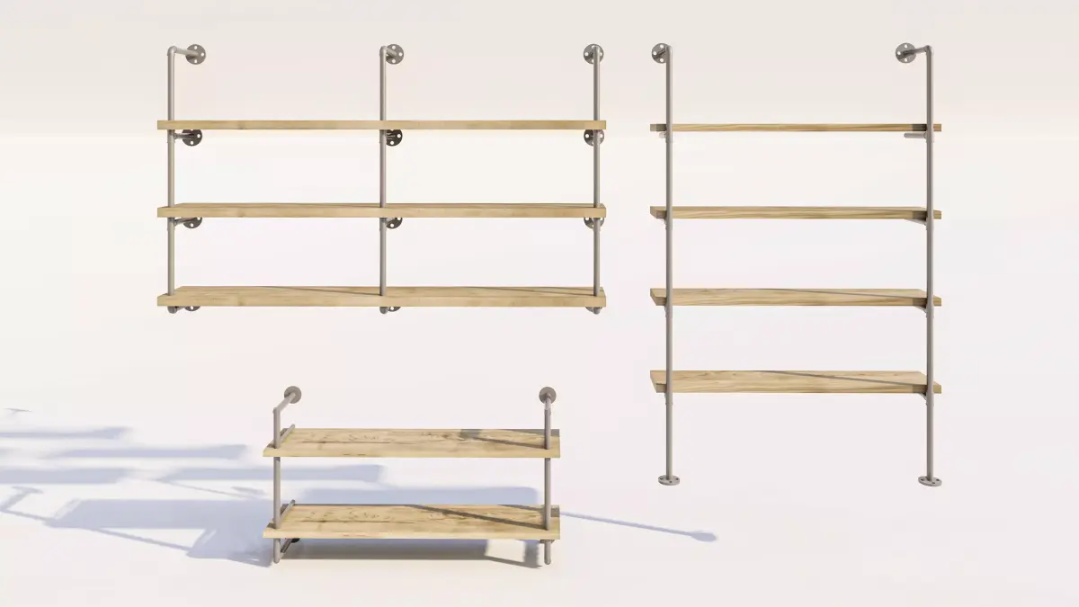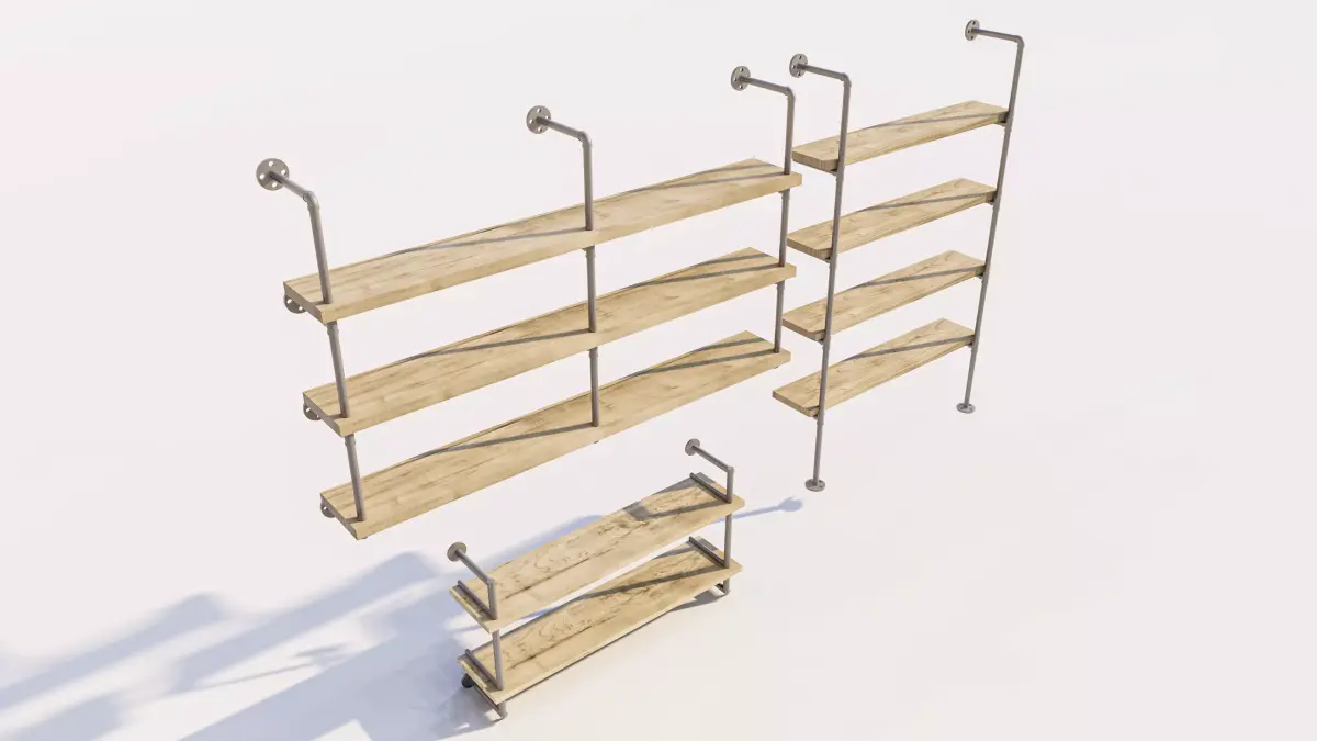 This is a high-detail 3D model collection of Wall-Mounted Floating Pipe Shelves, designed for professional interior architectural visualizations (Arch-Viz). Combining rugged industrial aesthetics with functional storage, this set is ideal for staging living rooms, home offices, and contemporary retail spaces.
