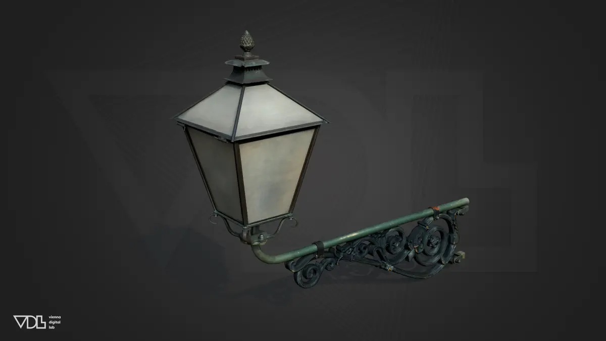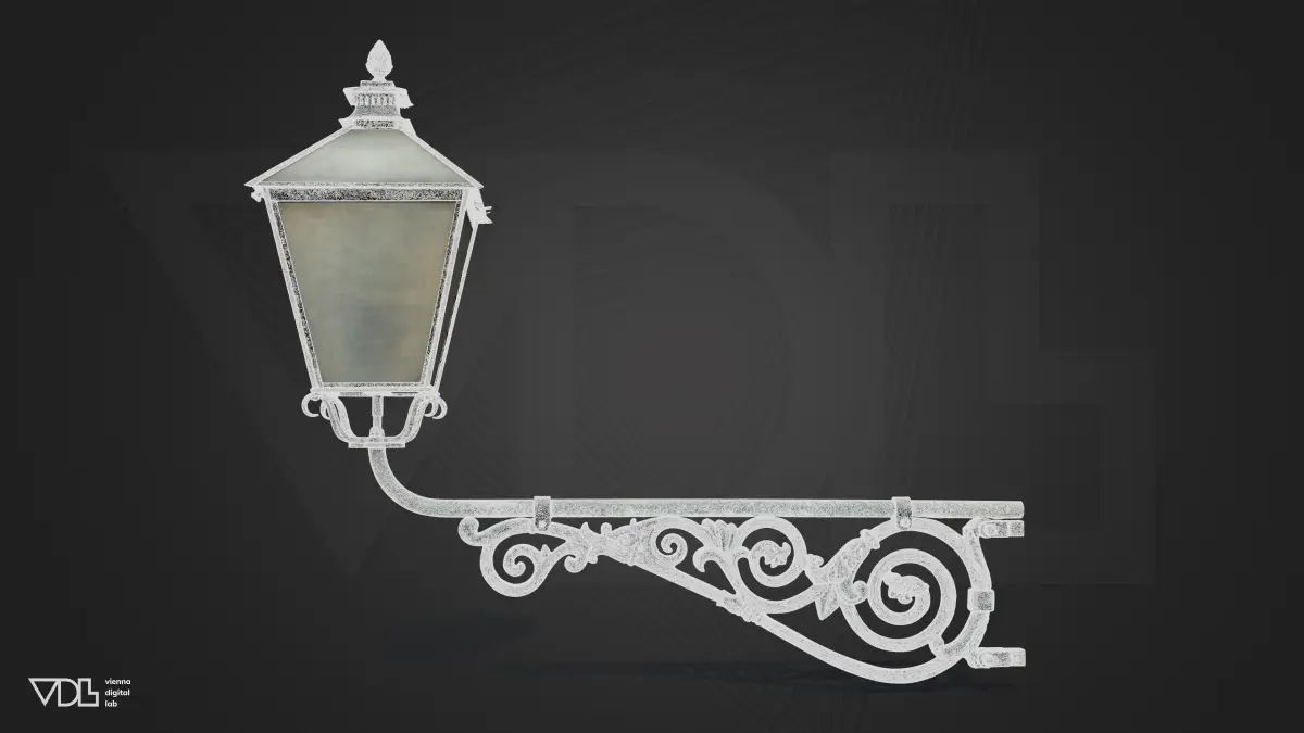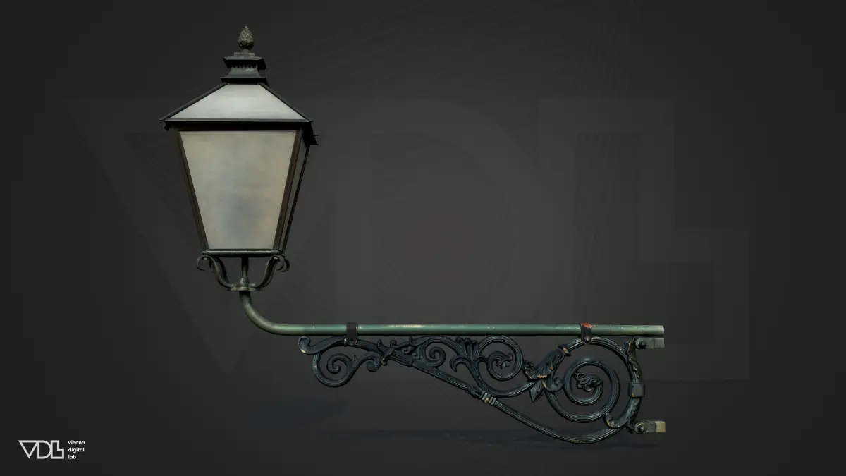 Built in the late 17th / early 18th century, this wall-mounted lamp is an original, hyper-realistic 3D scan from the Austrian Imperial Palace in Vienna, Austrias most prestigious cultural heritage sites and a central axis of influence on European history during the Habsburger Monarchy stretching from the late Middle Ages until the early 20th century. The lamp is designed in the Baroque style, characterized by its ornate and intricate details. Baroque art and architecture features bold contrasts, curvaceous forms, and elaborate ornamentation, which can be seen in the design of the lamp. It is made from high-quality materials such as wrought iron, and includes elements of glass. The craftsmanship involves detailed metalwork and finishing, showcasing the skill of the artisans who created them.