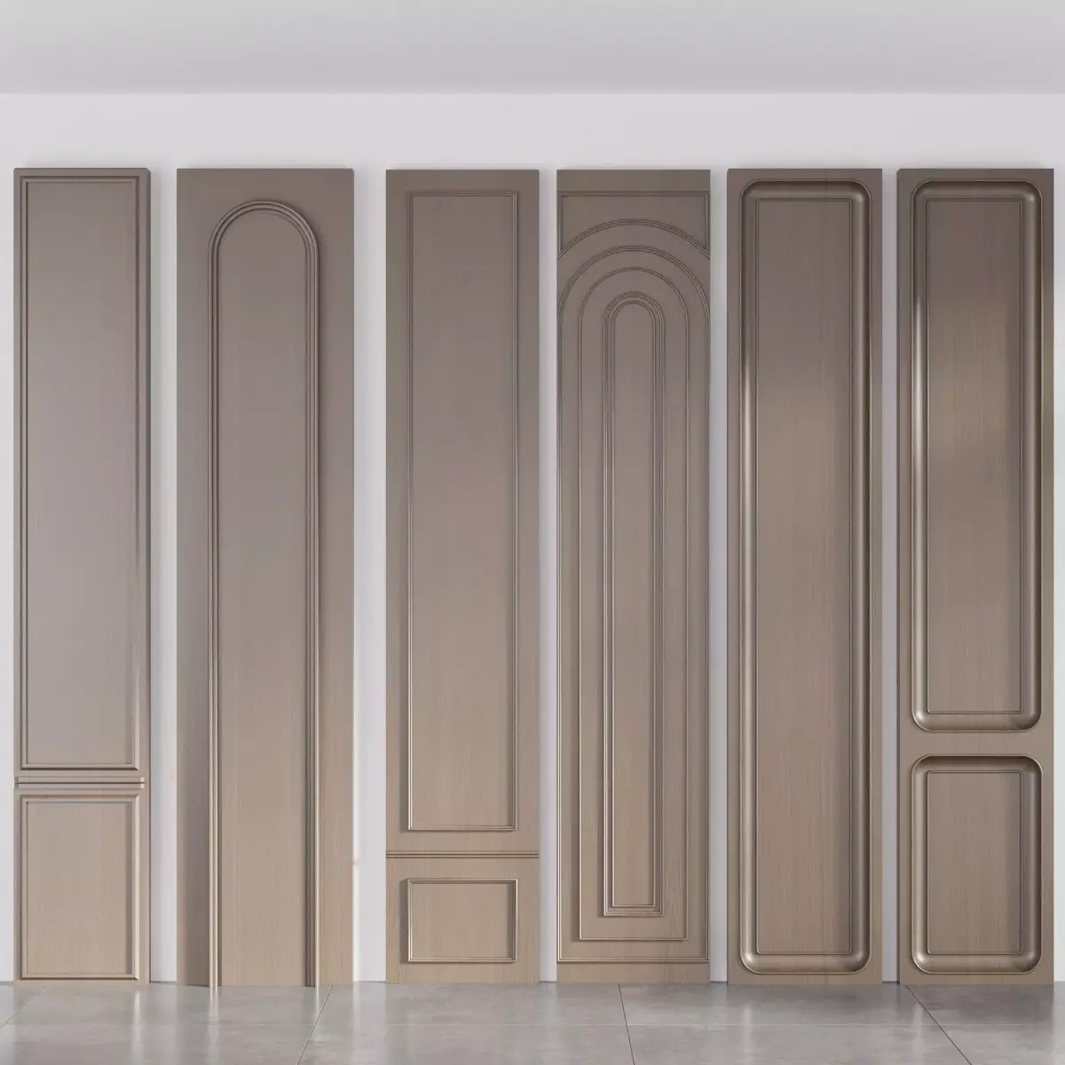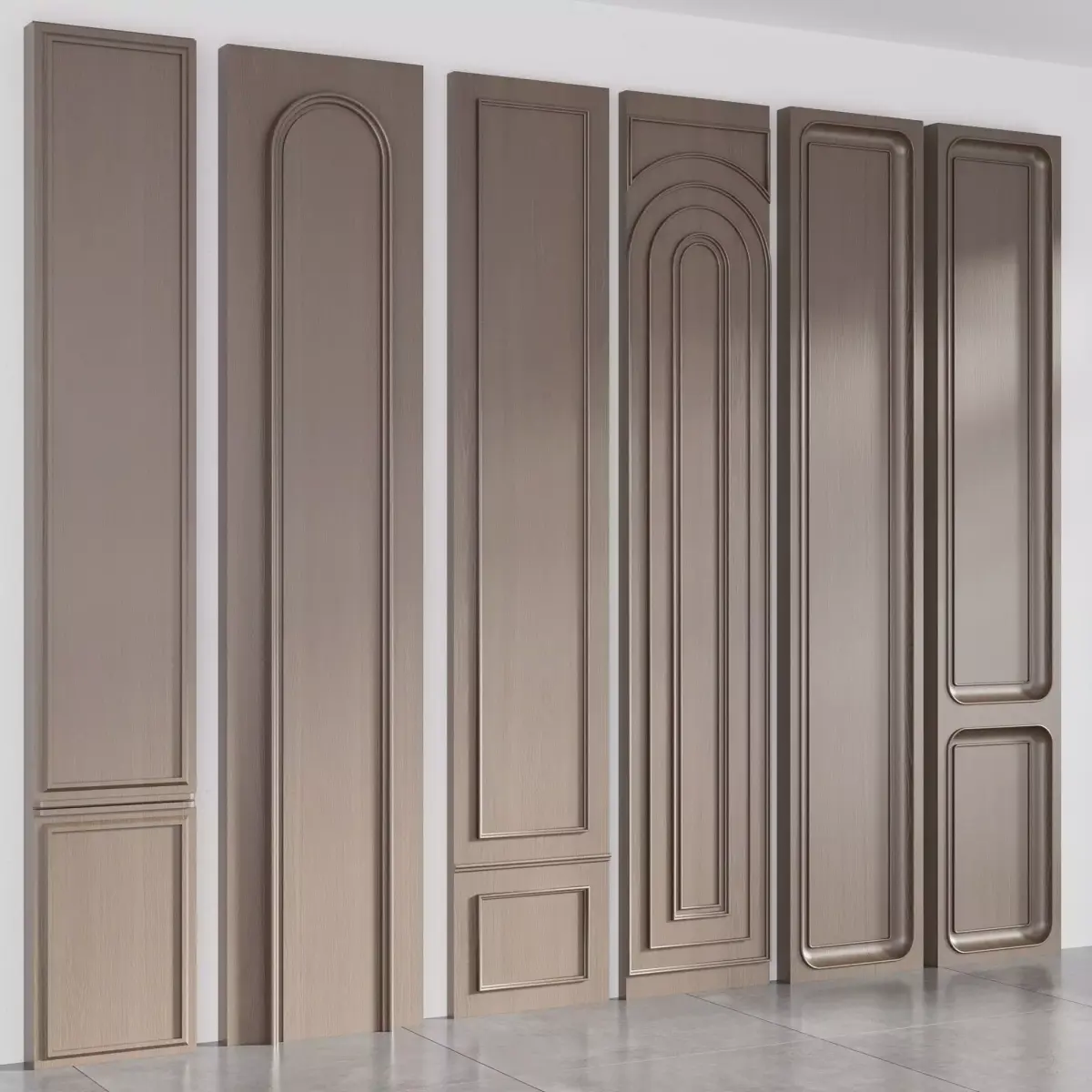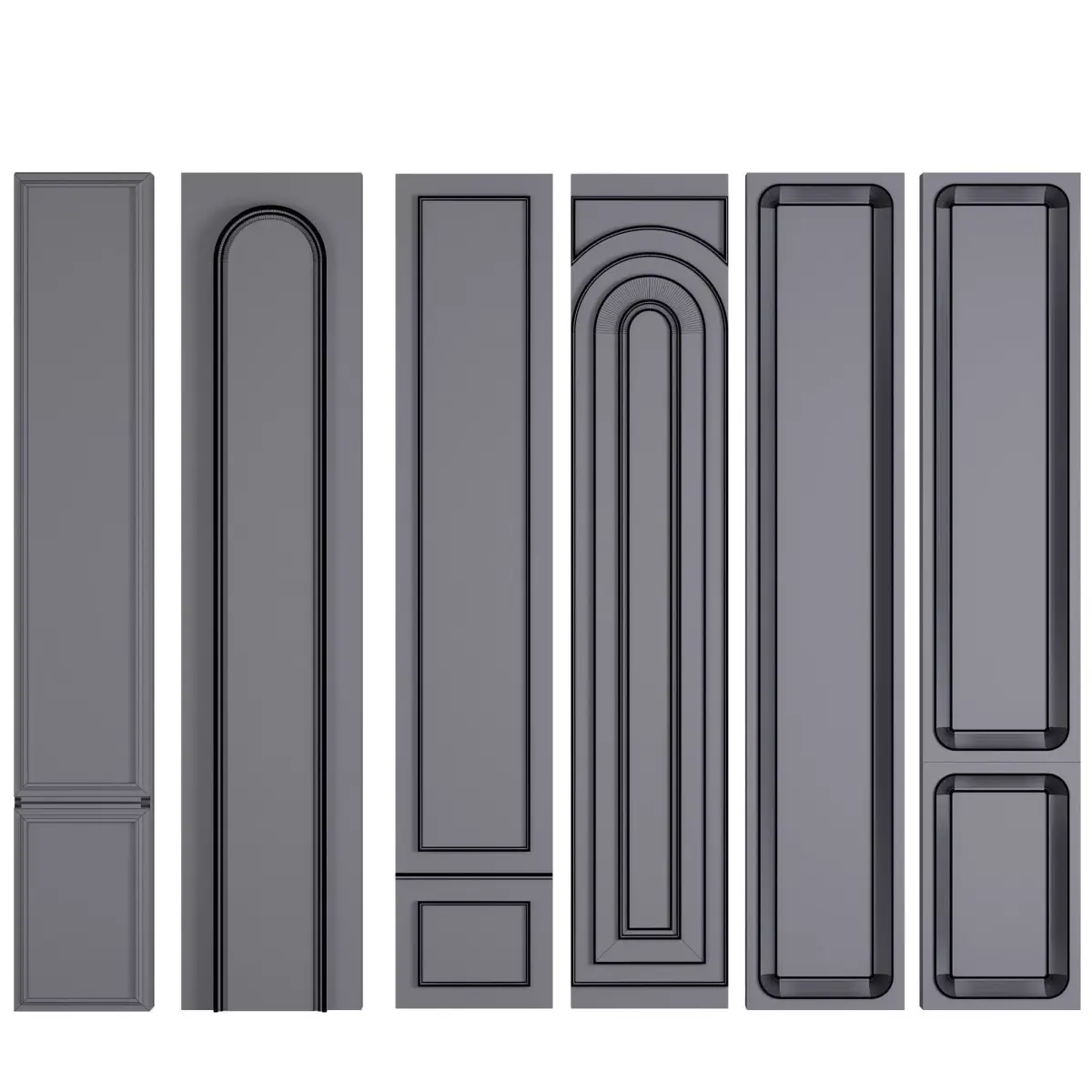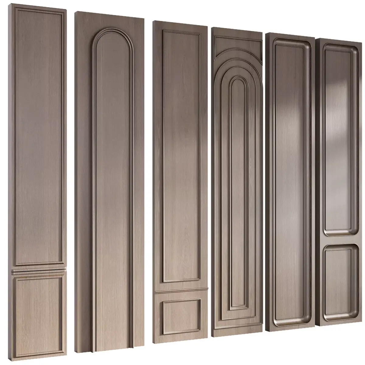 This model features a high-quality collection of wooden wall panels created with a mix of classic and contemporary design elements. Each panel includes unique molding profiles—such as rounded corners, arched trims, layered frames, and deep decorative carvings—allowing designers to create sophisticated interior compositions.The set contains multiple vertical panel variations, ideal for enhancing residential and commercial spaces including hotel lobbies, corridors, luxury living rooms, offices, and custom cabinetry. Clean topology, realistic wood textures, and precise detailing make this asset suitable for close-up renders and professional visualization workflows.Perfect for architects, 3D artists, and interior designers who need modular, elegant wall paneling for premium environments.
