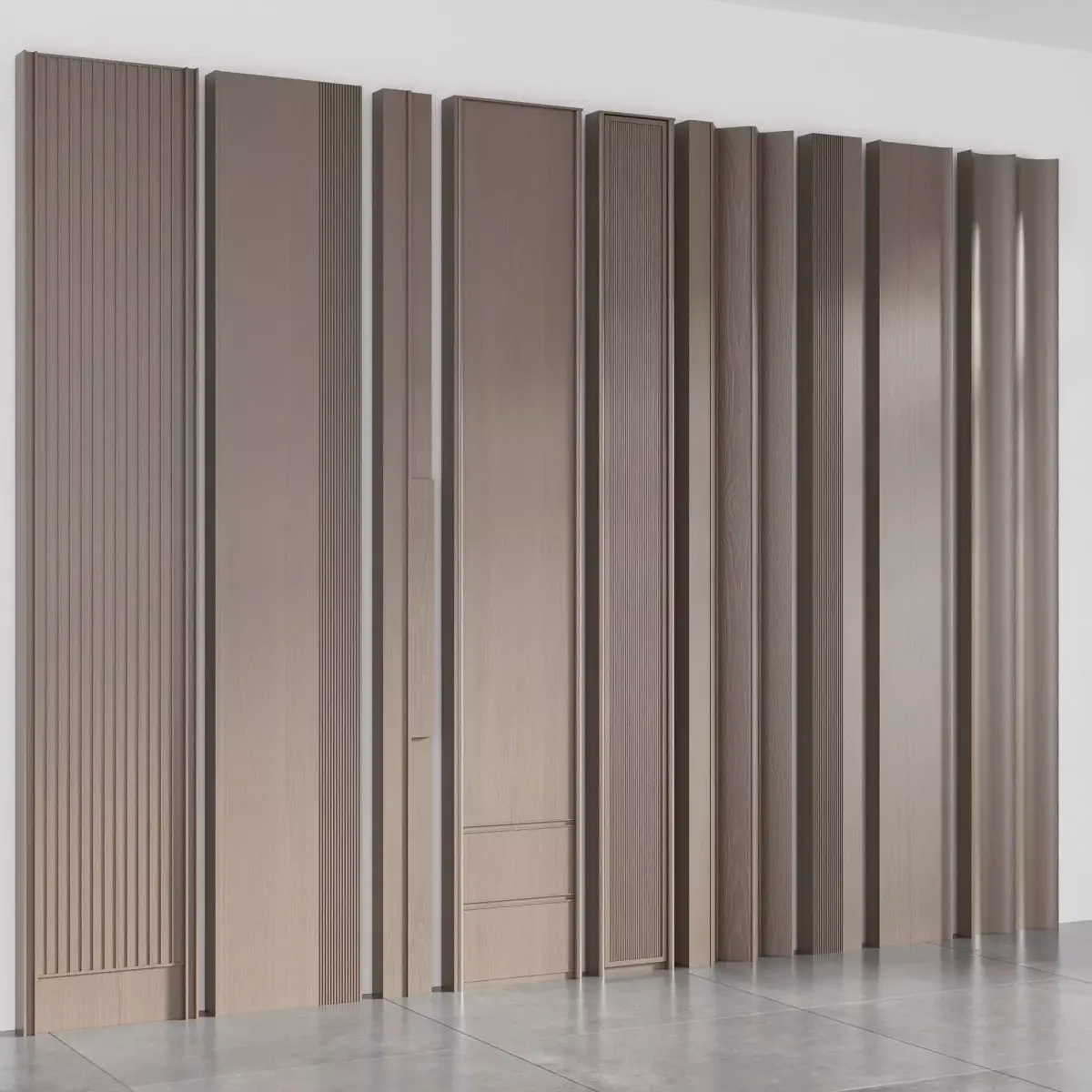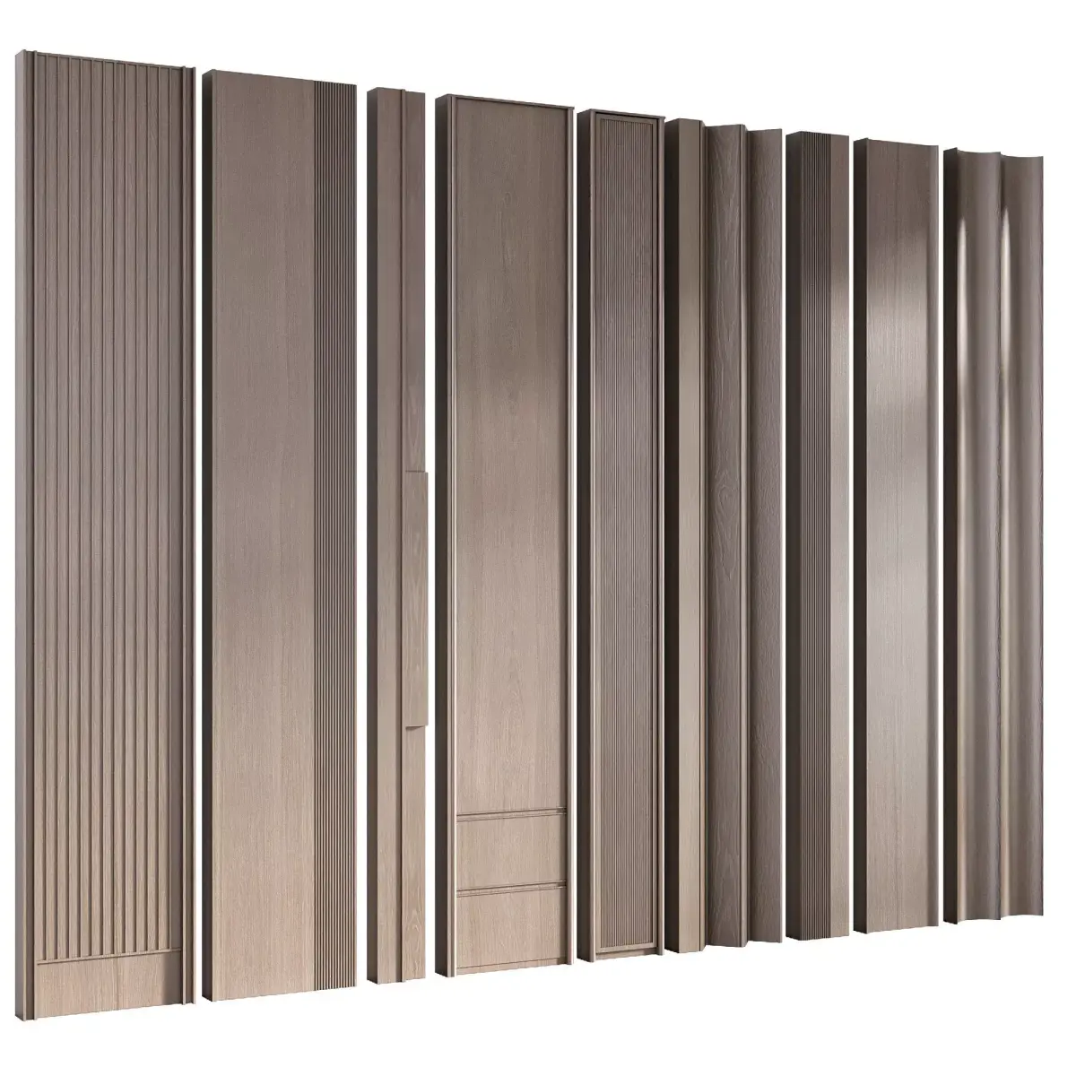 This premium set of modern wooden wall panels is designed for high-end interior visualization and architectural projects. The collection features a variety of vertical panel profiles including grooved panels, smooth panels, narrow trims, decorative columns, and rounded modular elements. Each panel is modeled with clean geometry and accurate proportions, making it ideal for luxury homes, hotels, lobbies, restaurants, and office interiors.