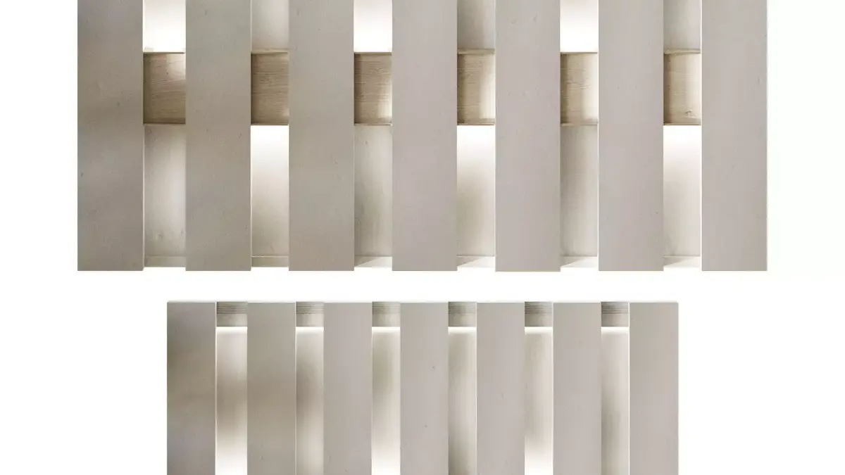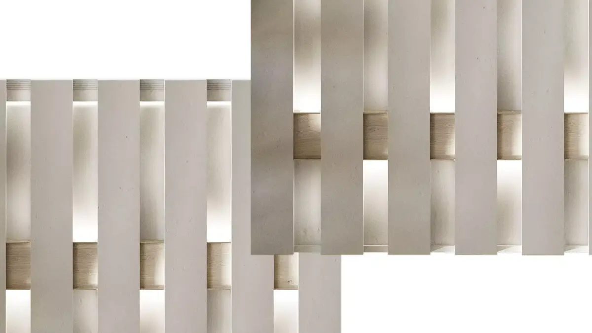 Key Features:Dimensions: Impressive scale with a length of 510 cm and a height of 350 cm, designed to cover substantial wall areas.Materials: Realistic light wood grain and matte gypsum textures.Optimization: Extremely efficient geometry with only 1.2K polygons, allowing for high-quality renders without slowing down the scene.Versatility: Works beautifully with grazing light to emphasize the rhythmic vertical slats and plaster texture.