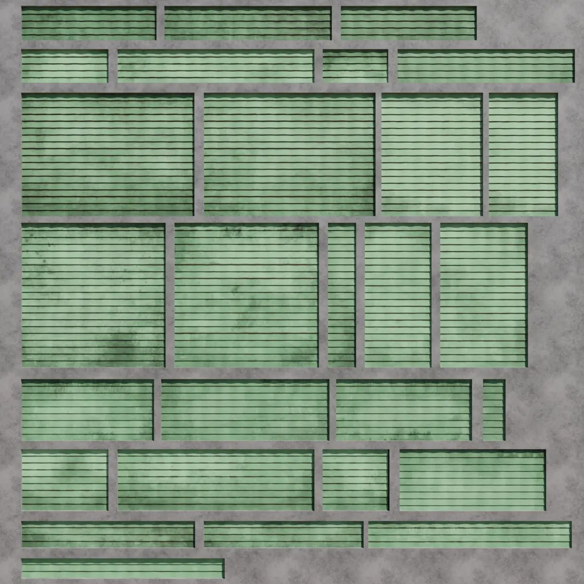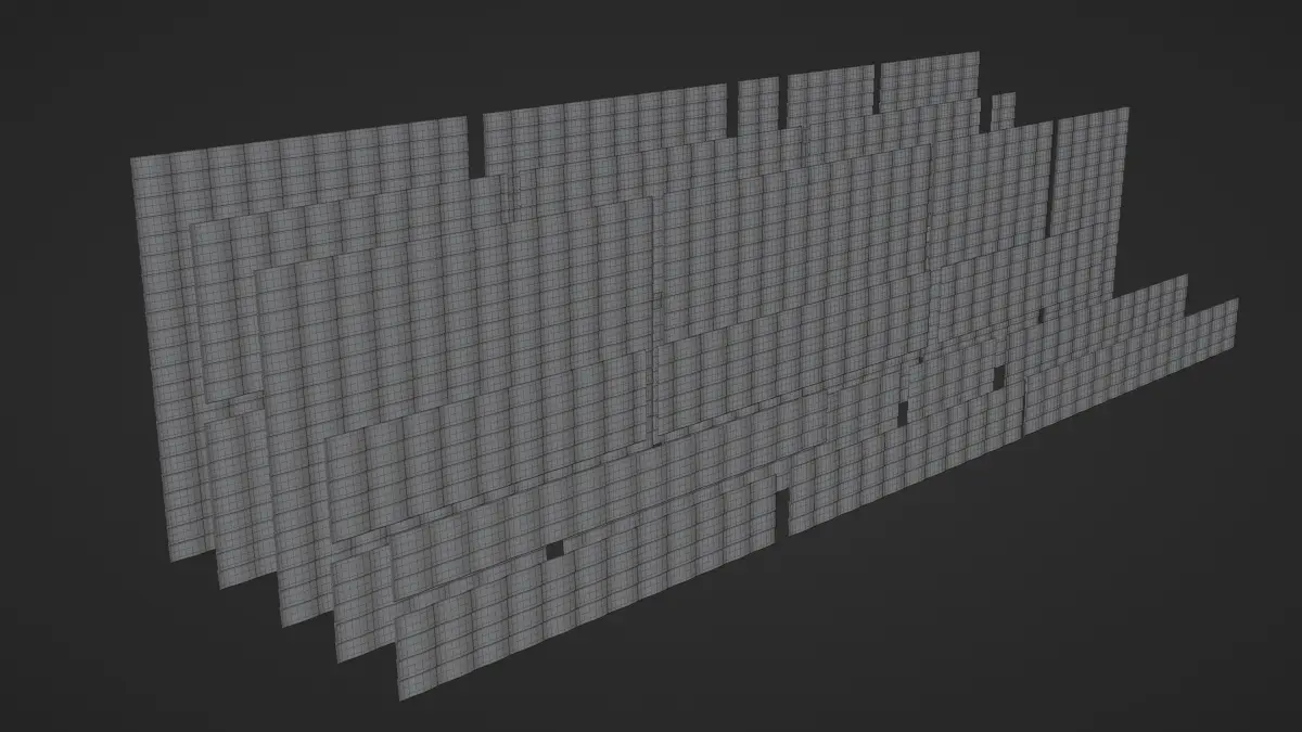 Set of dusty textured wall panels, include 28 tiles.Textures include two tiles 4k UDIM maps of diffuse and roughness. FBX, OBJ file formats and native blend file version 3.3. Make sure you know how to import UDIMs, otherwise, check the tutorials on how to do it for your 3D software.Pre-render in Blender Cycles using basic HDRI.Model does not include concrete facade used for previews.