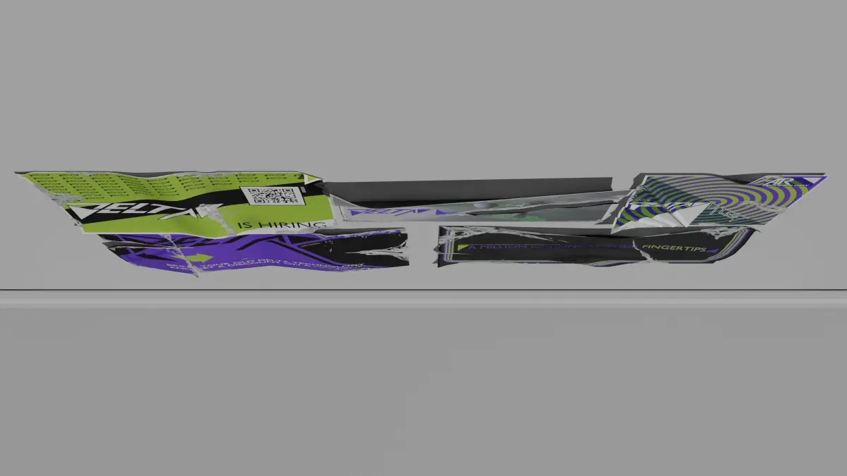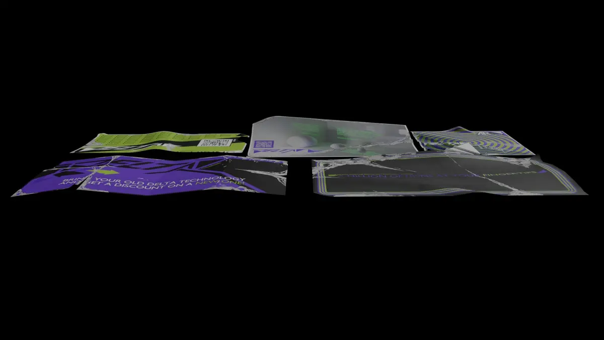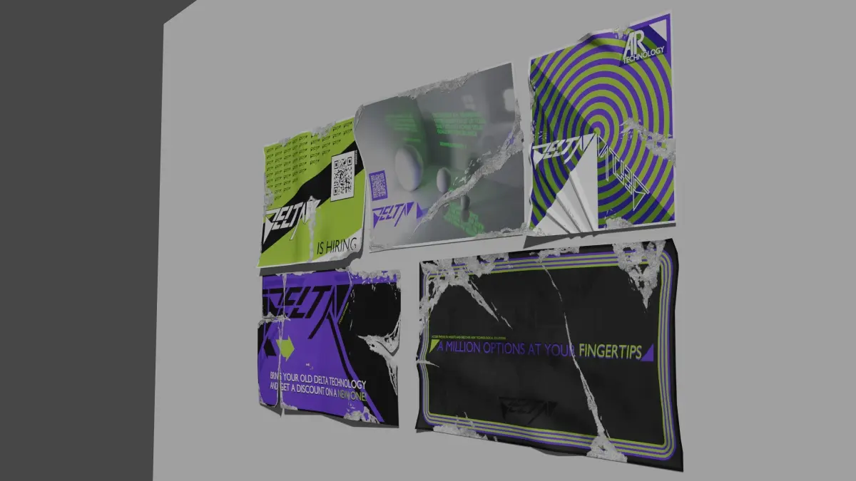 A Low-poly 3D model of some wall posters with a fictional brand called Delta, made in Blender 3.0
