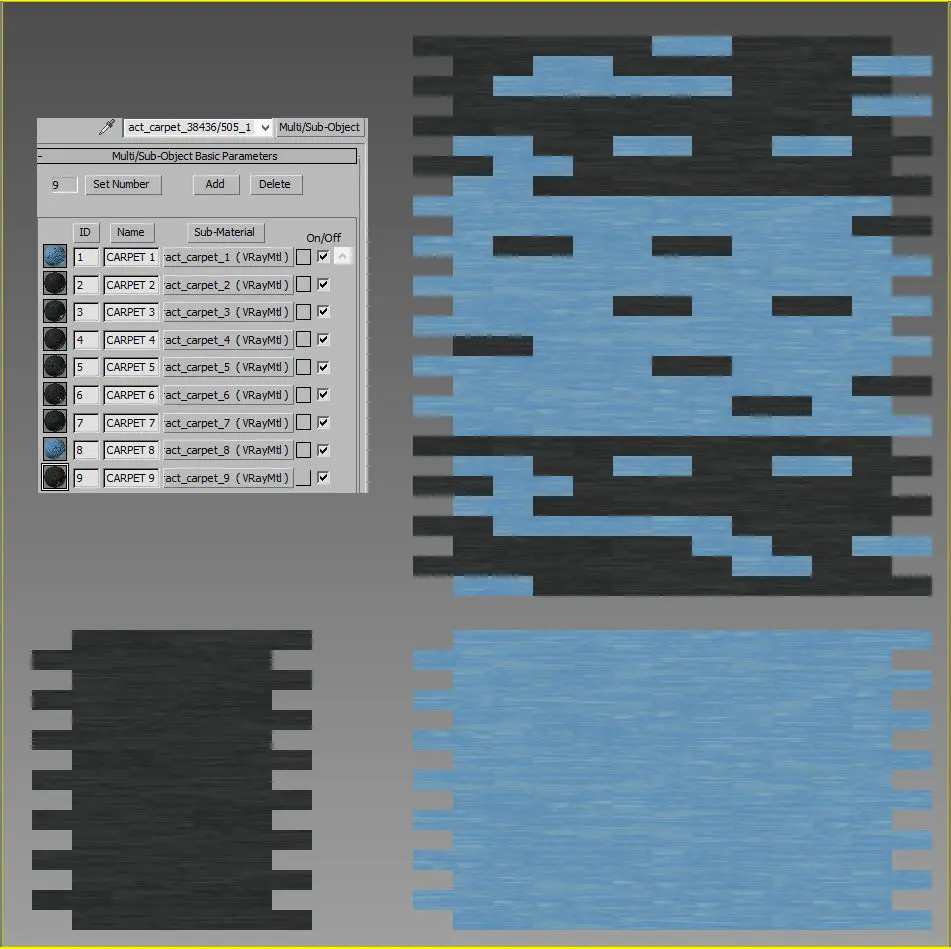 Carpet Tiles Two color and 18 high resolution textures. All textures diffuse and bump map include file. Resolution: 675x2700 px