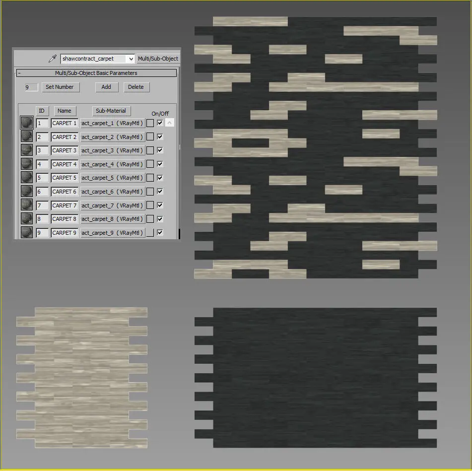 Carpet Tiles Two color and 18 high resolution textures. All textures diffuse and bump map include file. Resolution: 675x2700 px No plugins, only Multi / Sub-Objec