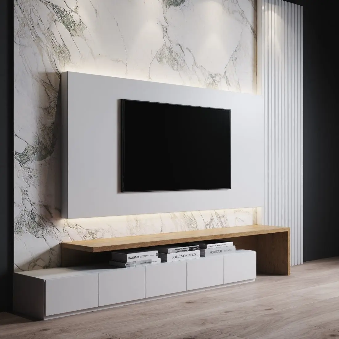 the set includes horizontal cabinets, a wooden panel, books, marble panel