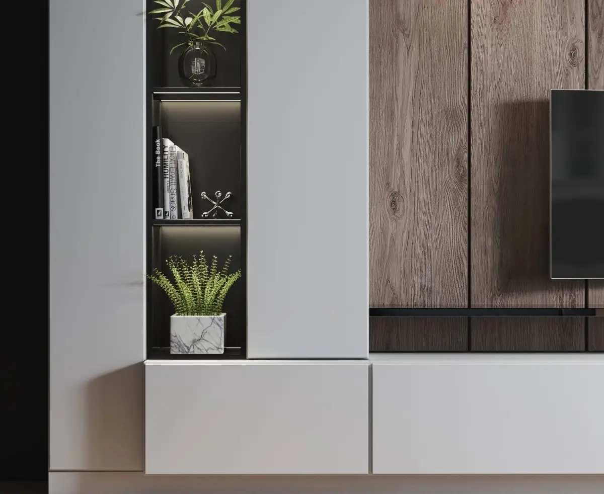 the set includes vertical and horizontal cabinets, a black glass shelf, a wooden panel, a mirror and decor in the form of plants and books