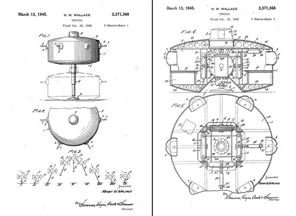 The patent for this odd design came from Henry W. Wallace of Freeport, New York State, USA.This invention relates to a vehicle, and more particularly to a tank which is propelled by means of an operating leg.One Of the objects of this Invention is to provide a tank having an extensible leg capable of imparting a series of vertical oscillations to the tank, and having means to very the angle of inclination of the leg to obtain directional movement of the tank.Yet another object of the invention is to provide a tank which is propelled in such a manner that its progress is intermittent, thereby rendering it a difficult target.