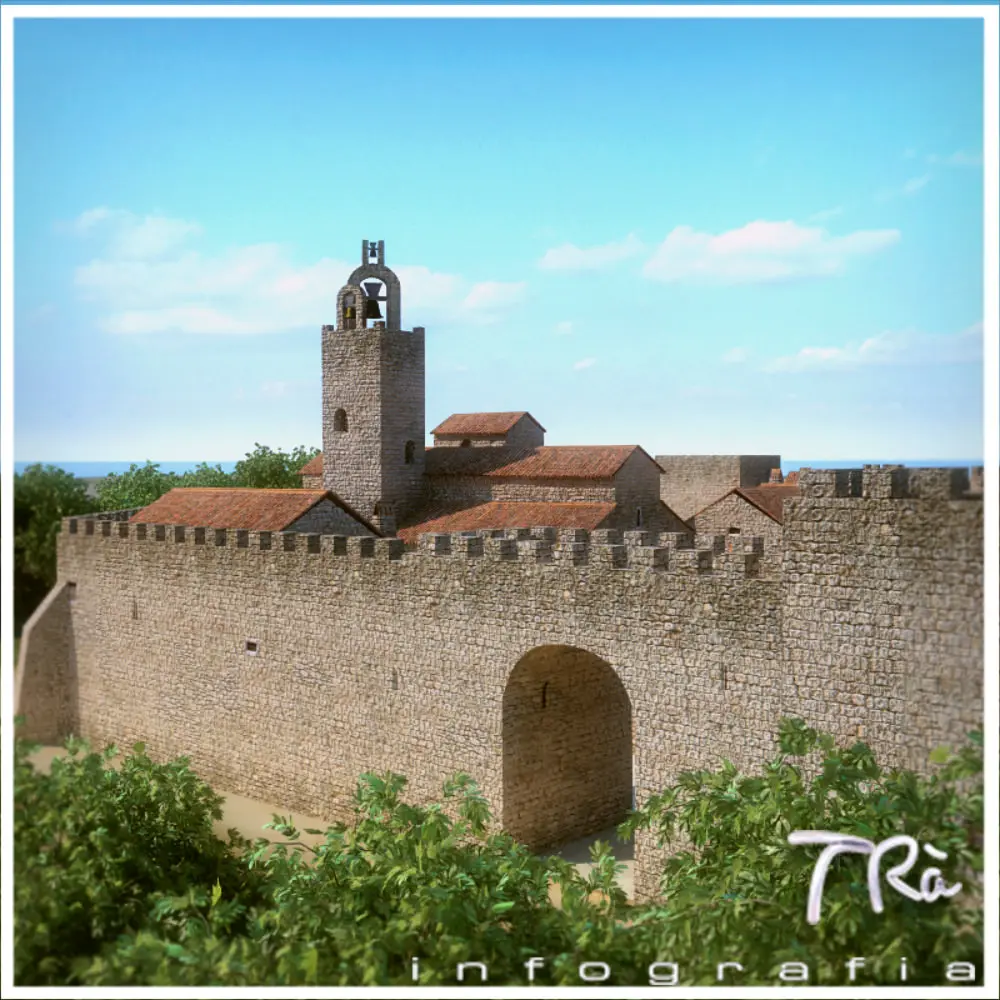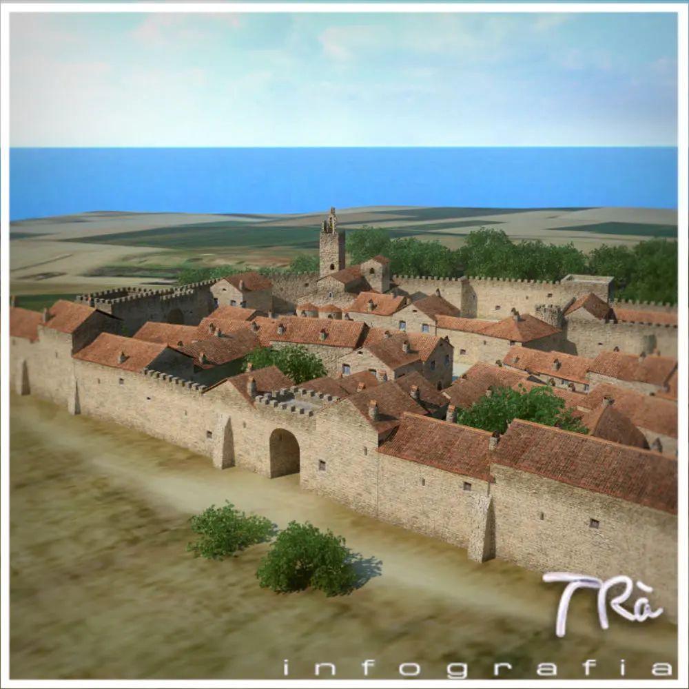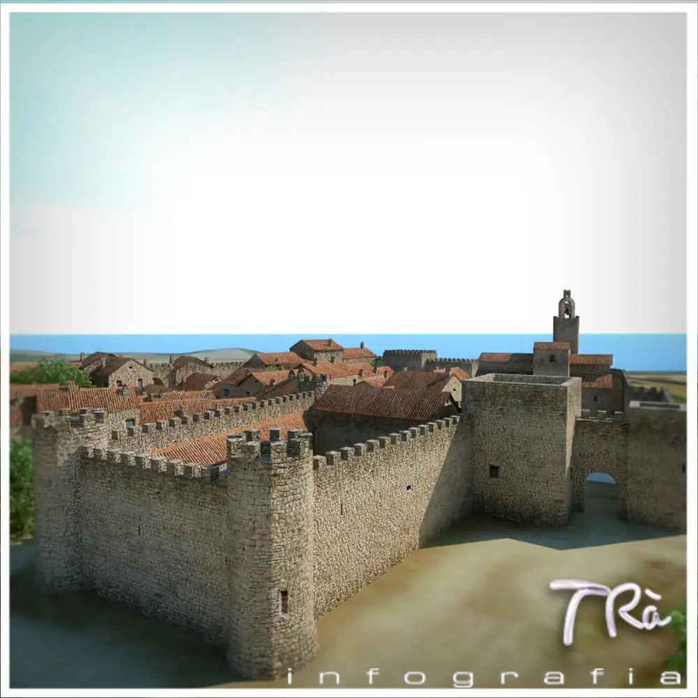 Walled medieval town with castle and church, bridge river crossing, ordered in layers, geometries and textures open and fully modifiable and adaptable to your project, set with standard fog. Land around realistic. Modeling with Max 2010 and Vray materials. Vegetation not included.