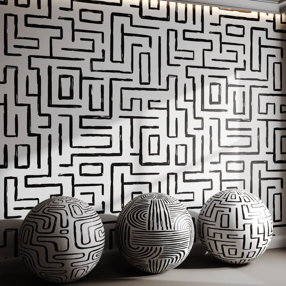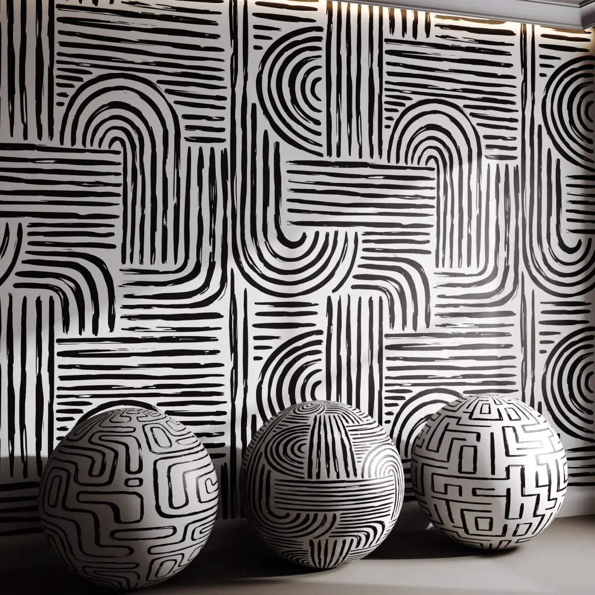 Tags: bold wallpaper, graphic lines, abstract pattern, tribal modern, monochrome decor, black and white design, contemporary interior, hand-drawn look, maze print, urban wall art, linear graphic, modern statement wall, organic shapes, minimalist pattern, geometric texture, creative wallpaper, edgy interior, hallway feature wall, designer wallcovering, abstract geometry