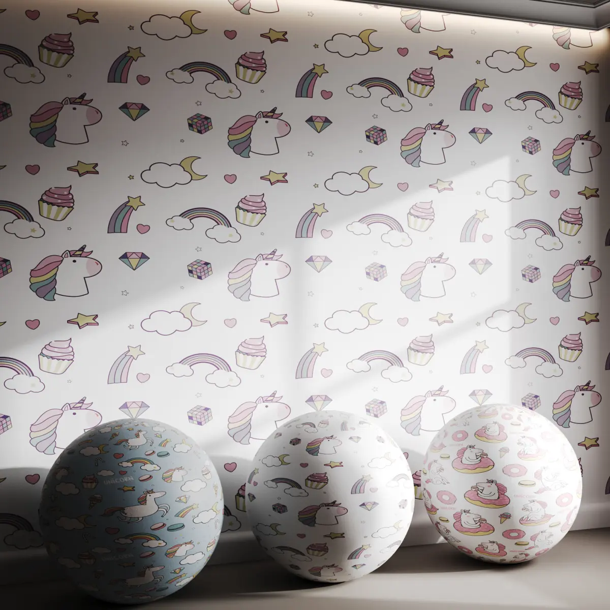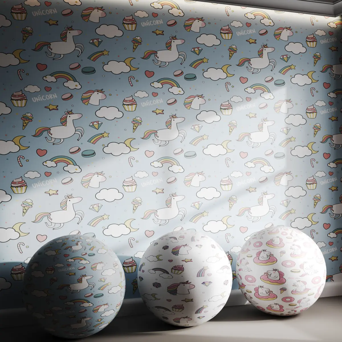 Tags: unicorn, rainbow, pastel, clouds, stars, hearts, cupcakes, kids room, fantasy, cute decor, whimsical, magical, dreamy, ice cream, donuts, macaron, girly wallpaper, cartoon, playful, soft colors