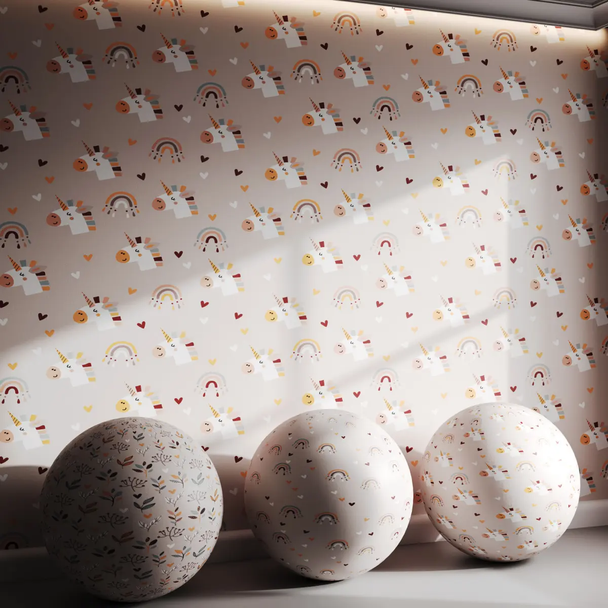 Tags: unicorn wallpaper, rainbow wall decor, pastel children’s room, cute pattern wall, nursery wallpaper, soft heart motif, modern kids design, whimsical wall texture, pastel unicorn print, kawaii wallpaper, 3D model wall decor, corona render wallpaper, kids bedroom design, playful wallpaper texture, baby room wallcovering, heart pattern seamless, digital wallpaper design, unicorn theme interior, cheerful pastel art, vector-style wallpaper