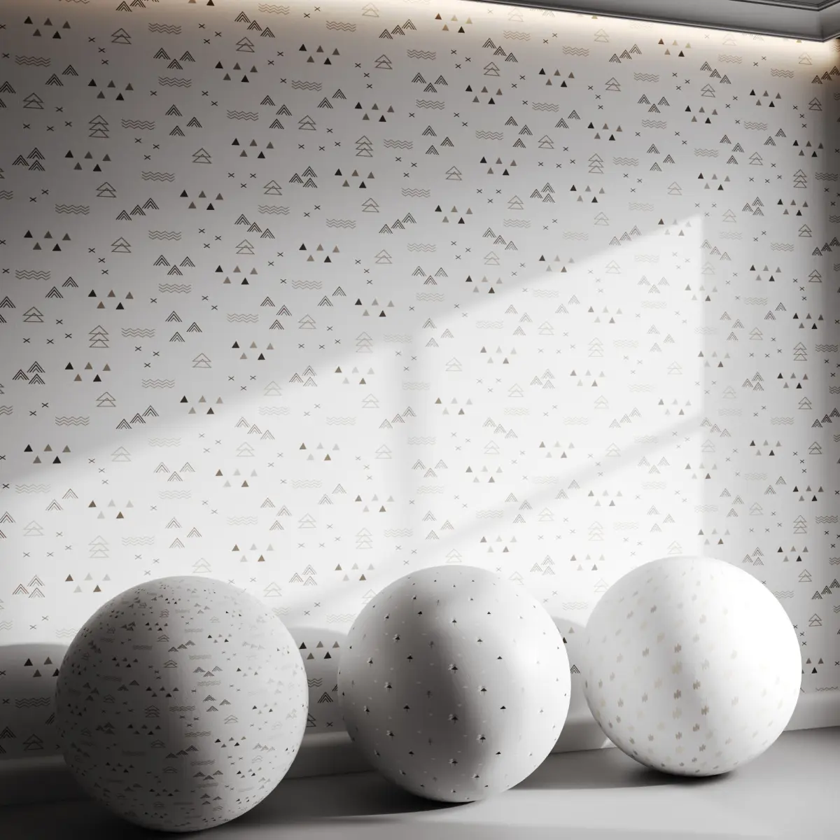 Tags: wallpaper, kids room, forest theme, triangle pattern, modern wallpaper, nursery decor, geometric print, baby room, Scandinavian style, soft tone, pastel wallpaper, minimalist design, child-friendly, vector pattern, seamless texture, mountain shapes, calming decor, baby design, 3d wall render, printable wallpaper