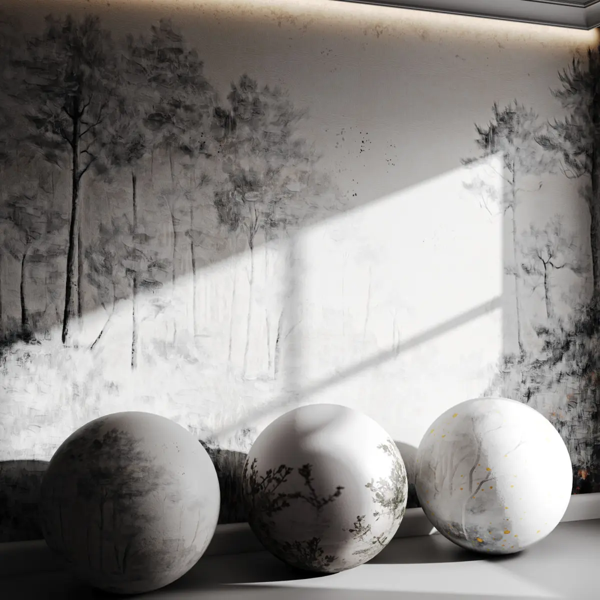 Name: Wallpaper 40Type: modelFormat: 3Ds Max 2016Export: FBX, OBJRender: Corona (10)Polys: 4626Verts: 4638Units: MillimetersDimension: 4000.17 x 1106.51 x 3011.62Description: Atmospheric forest-inspired mural wallpaper with delicate tree silhouettes and gold-accented mist effects, ideal for serene interior settings.Tags: wallpaper, mural, forest design, tree texture, fog effect, watercolor wall, artistic print, golden splash, nature wall art, 3d wall panel, living room decor, textured wallpaper, botanical, calming, soft tones, landscape mural, wallcovering, high-resolution, corona render, 3ds max