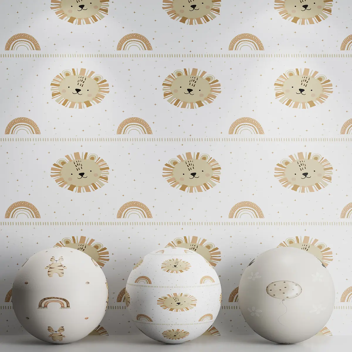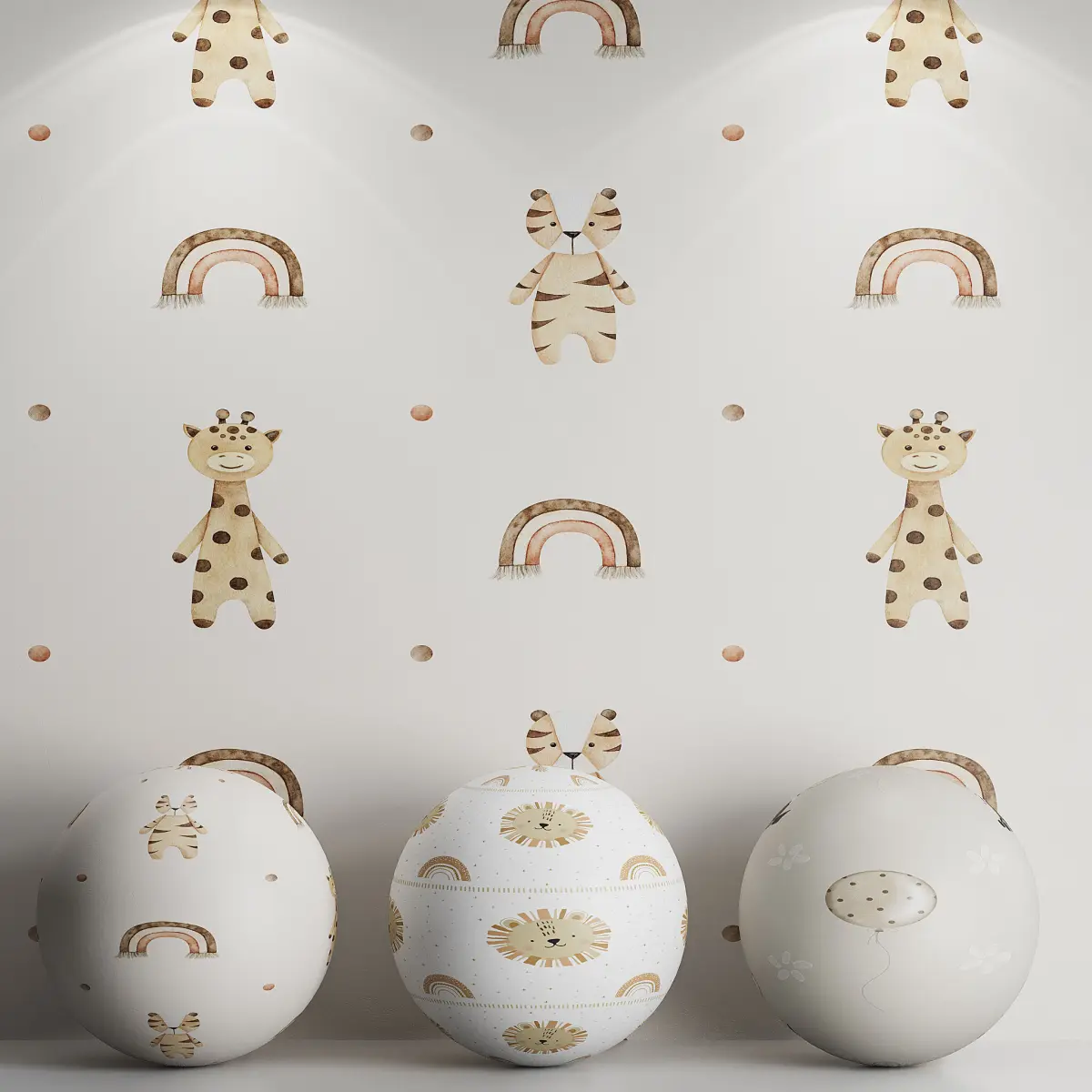 Tags: kids wallpaper, nursery wallpaper, animal pattern, giraffe, lion, tiger, rainbow decor, balloon print, pastel interior, children's room, watercolor design, baby room wall, seamless wallpaper, corona render, 3ds max, cute animals, soft colors, modern nursery, boho kids room, interior visualization, wall design