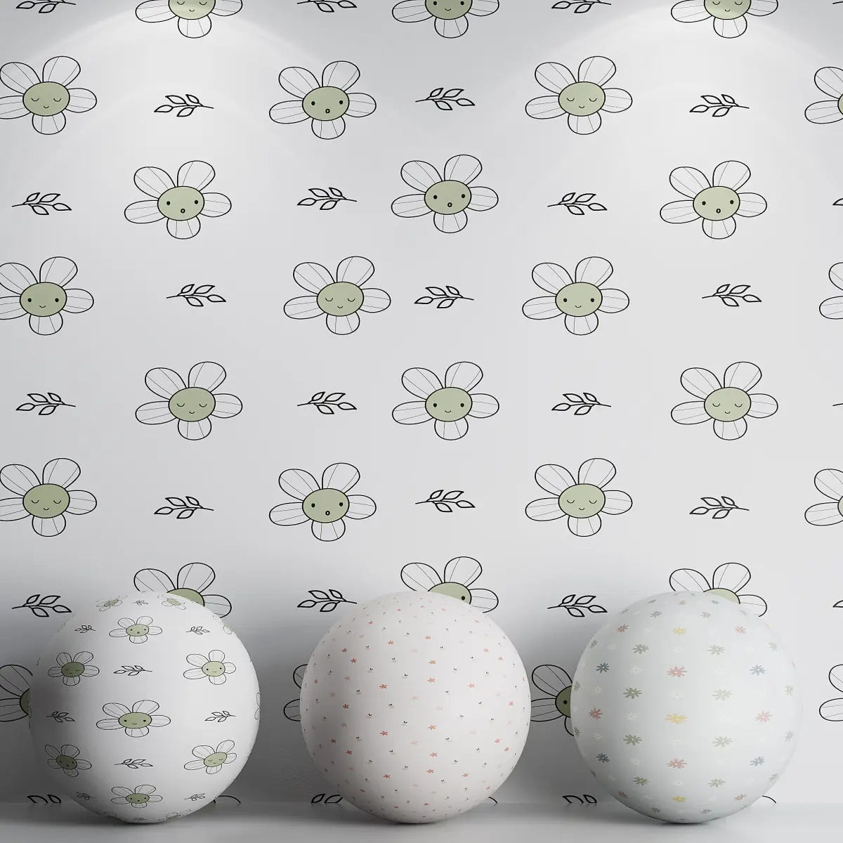 Tags: kids wallpaper, floral pattern, pastel decor, flower wall art, nursery design, 3D wallpaper, seamless wallpaper texture, daisy wallpaper, modern children’s room, soft color scheme, hand-drawn elements, botanical wallpaper, playful design, cheerful flowers, Corona Renderer, interior render, printable wall decor, high-quality texture, realistic visualization, baby room wallpaper