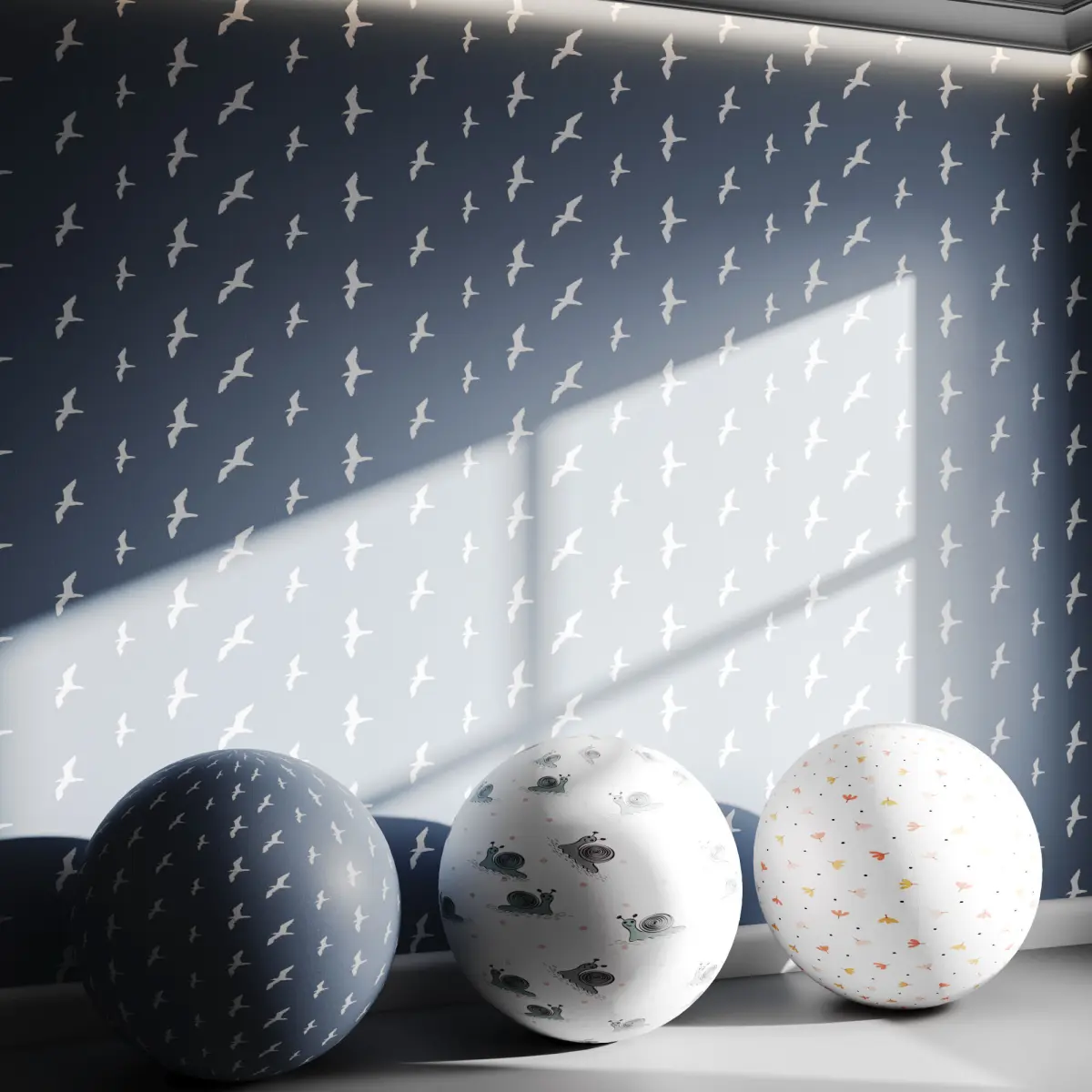 Tags: wallpaper, kids room, nursery wallpaper, birds in flight, tulip flowers, colorful florals, snail pattern, children’s interior, Scandinavian design, animal print, white birds, sky-themed wallpaper, modern nursery, pastel decor, cheerful wallpaper, cute motifs, whimsical nature, graphic kids wall art, soft minimalism, creative children’s space