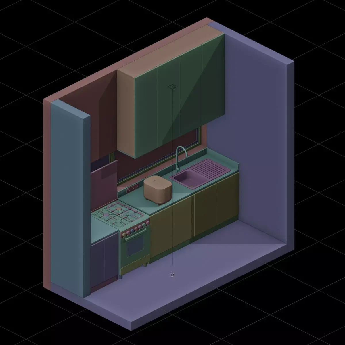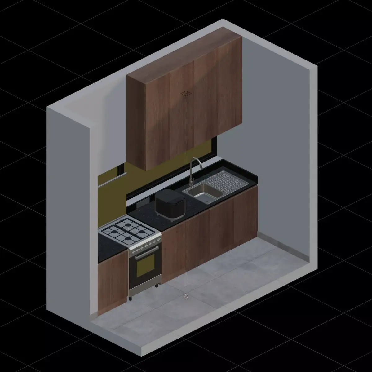 Isometric home kitchen interior 3d scene, including a stove, a rice cooker, and a sink, in a kitchen room, suitable for kitchen interior scene. Originally made in Blender also available in .OBJ and .FBX files.