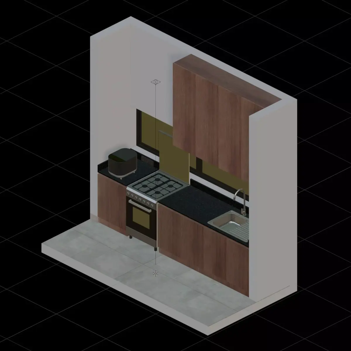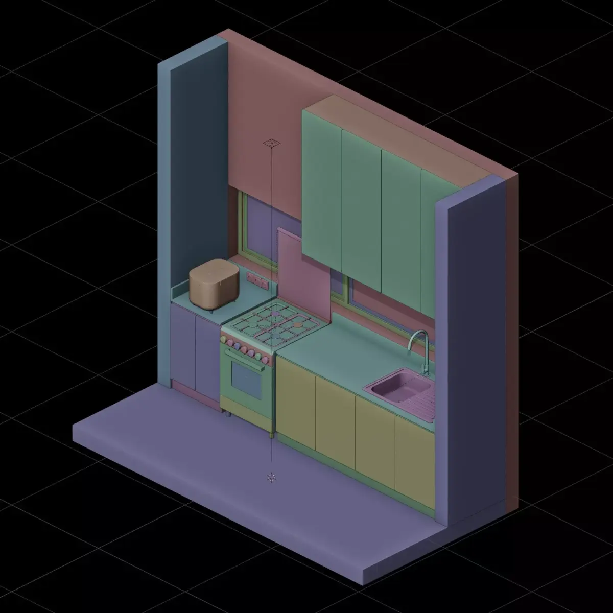 Isometric home kitchen interior 3d scene, including a stove, a rice cooker, and a sink, in a kitchen room, suitable for kitchen interior scene. Originally made in Blender also available in .OBJ and .FBX files.