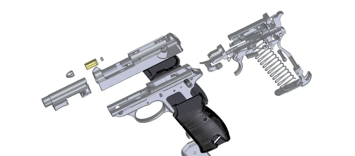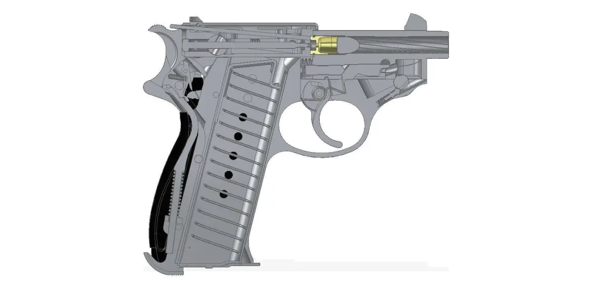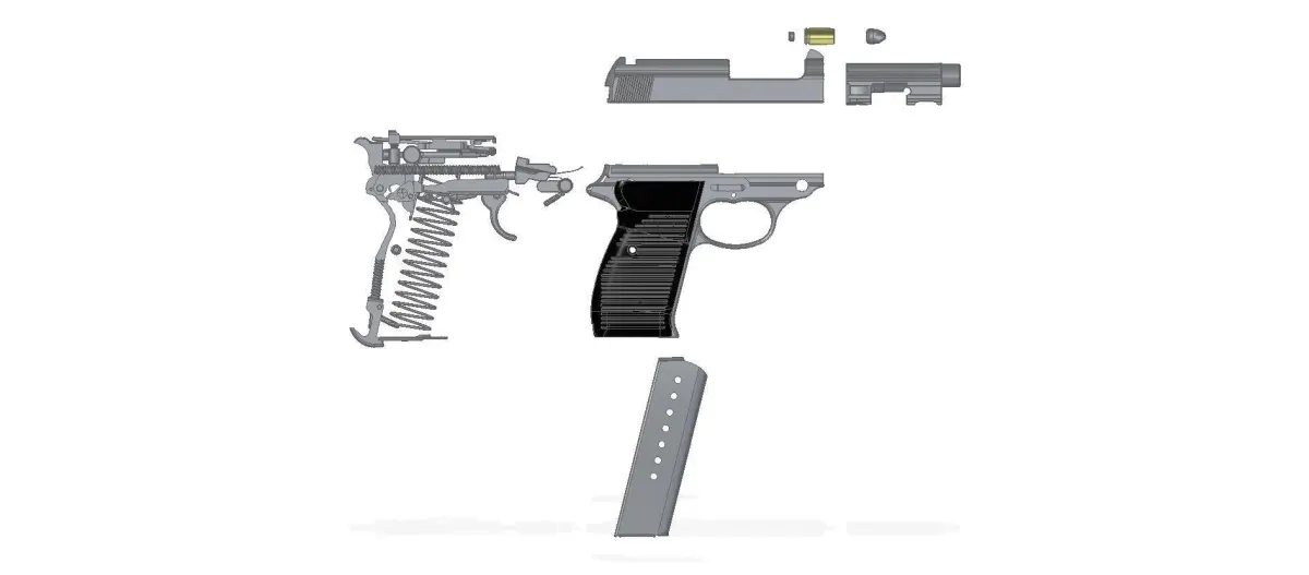 Full assembled model of German pistol Walther P38K and its 9mm Parabellum bullet.