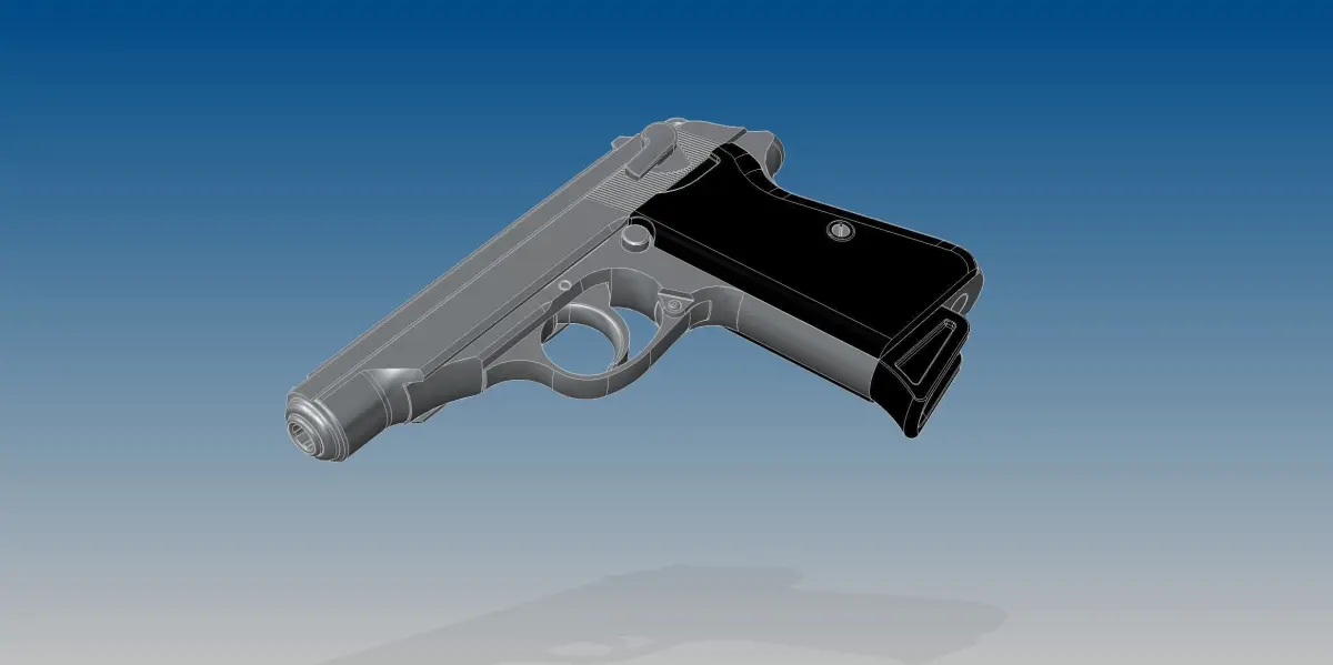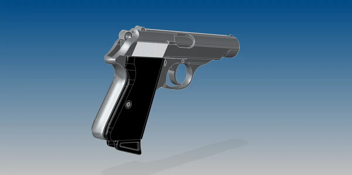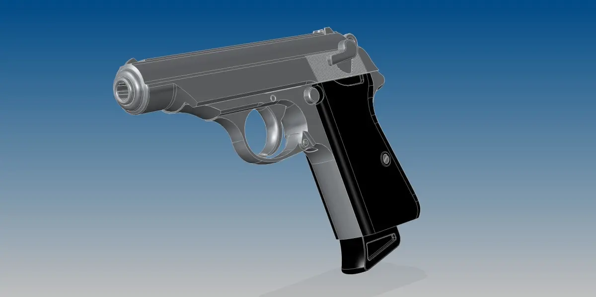 Full assembled model of German pistol Walther PP and its 7,65 mm bullet.