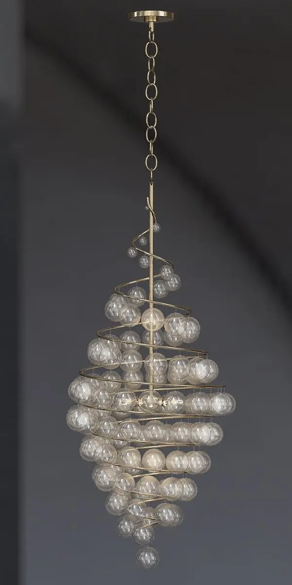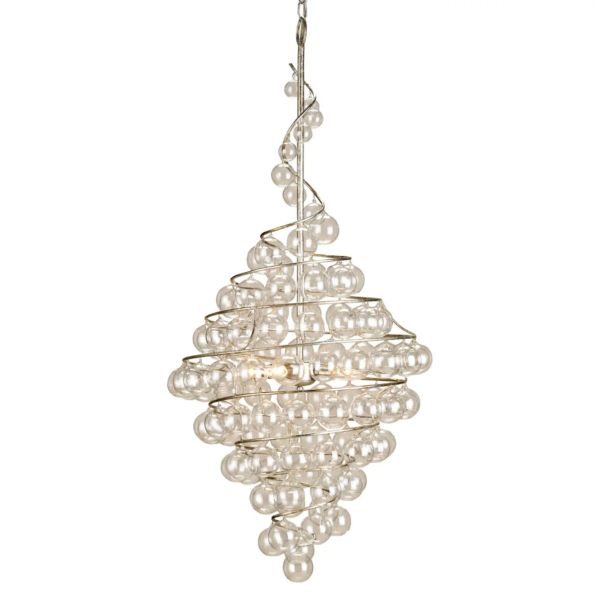 Wanderlust Chandelier in wrought iron features a tight spiral design with hand applied Silver Leaf and hand blown glass balls in graduated sizes. Four 60 watt 120 volt B10 candelabra base incandescent lamps not included. 20 inch diameter x 43 inches high. Includes 72 inches of chain.