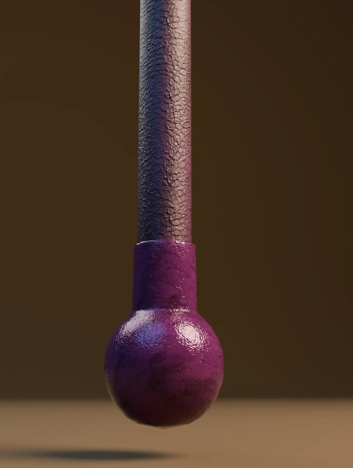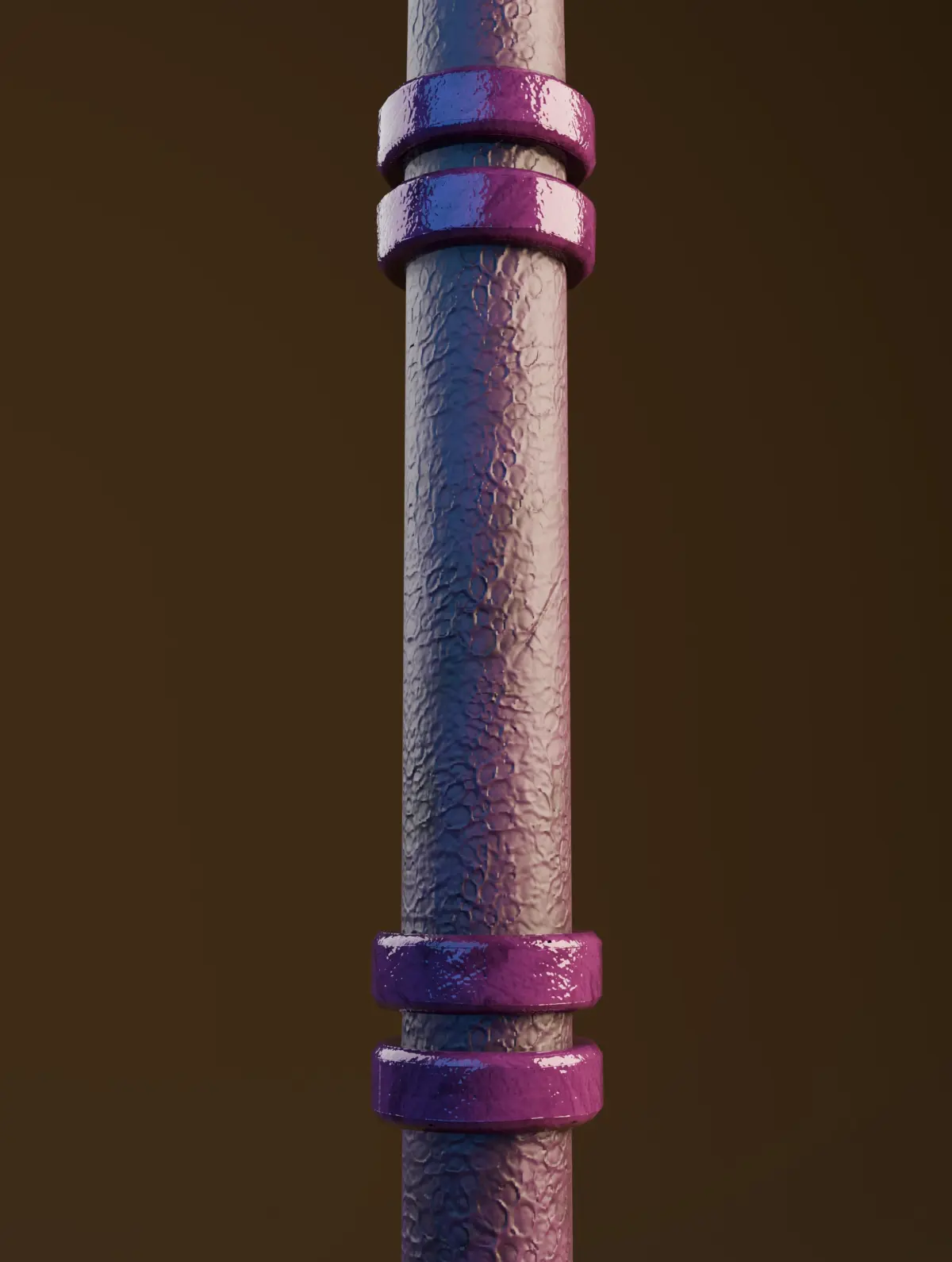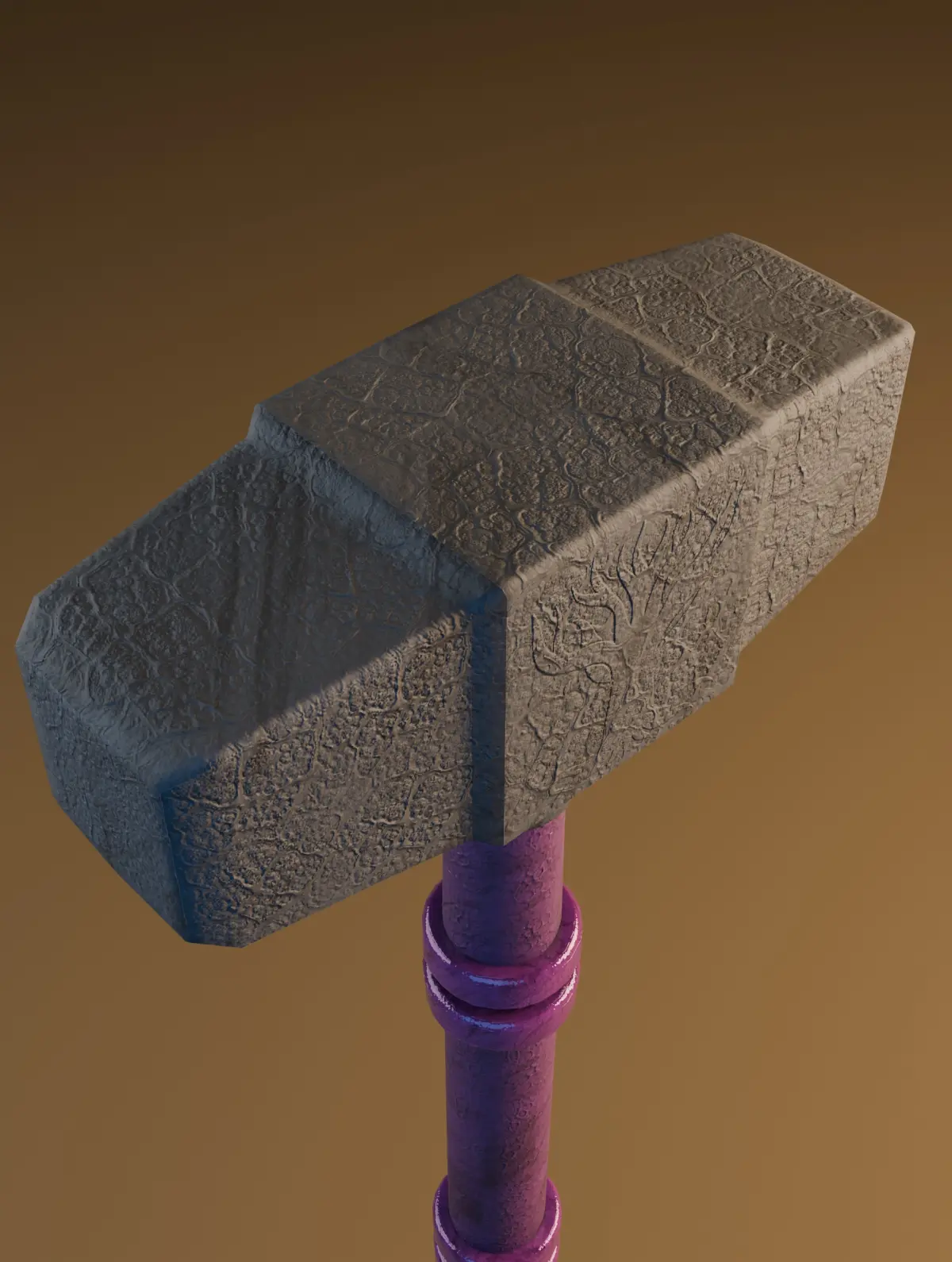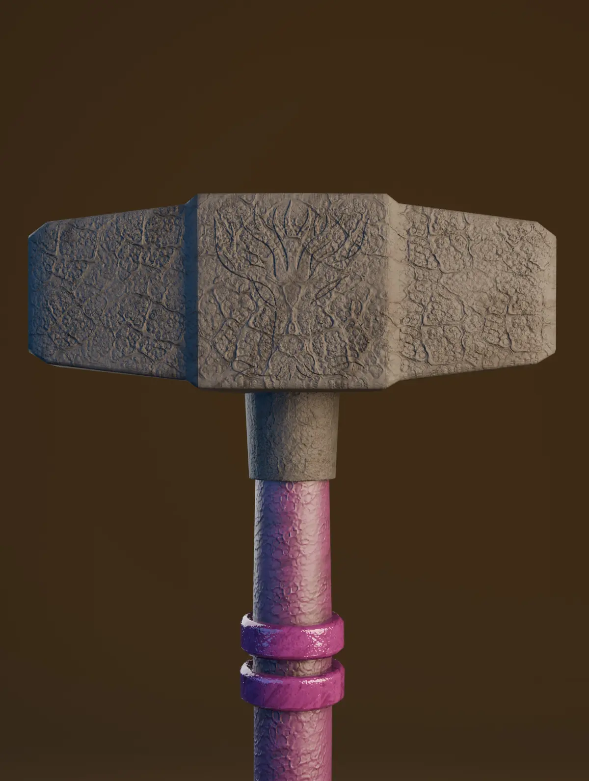 Low-poly Game ready 3D Model (1,396 polygons).This war hammer has a heavy, stone-like rectangular hammerhead with intricate engraved designs resembling branching tree patterns. The texture of the hammerhead appears cracked and weathered, giving it an ancient and rugged look. The handle is long and cylindrical, featuring a glossy, vibrant magenta color with a scaly texture, suggesting a mystical or organic material. Decorative magenta rings are positioned along the shaft, adding a distinctive aesthetic element.
