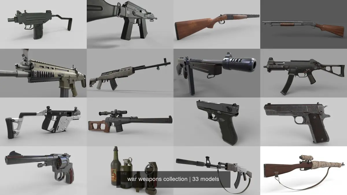 This collection contains 22 types of weapons, 7 different telescopic sights and 4 hand grenades.PBR, Low Poly materials, Most of the textures are 2k (in all weapons and in some telescopic sights).. in some cases they are 1k (Telescopic sights and Hand Grenades),But with an excellent quality, since the textures are TGA and do not lose detail. All the FBX are with resolved UVS.