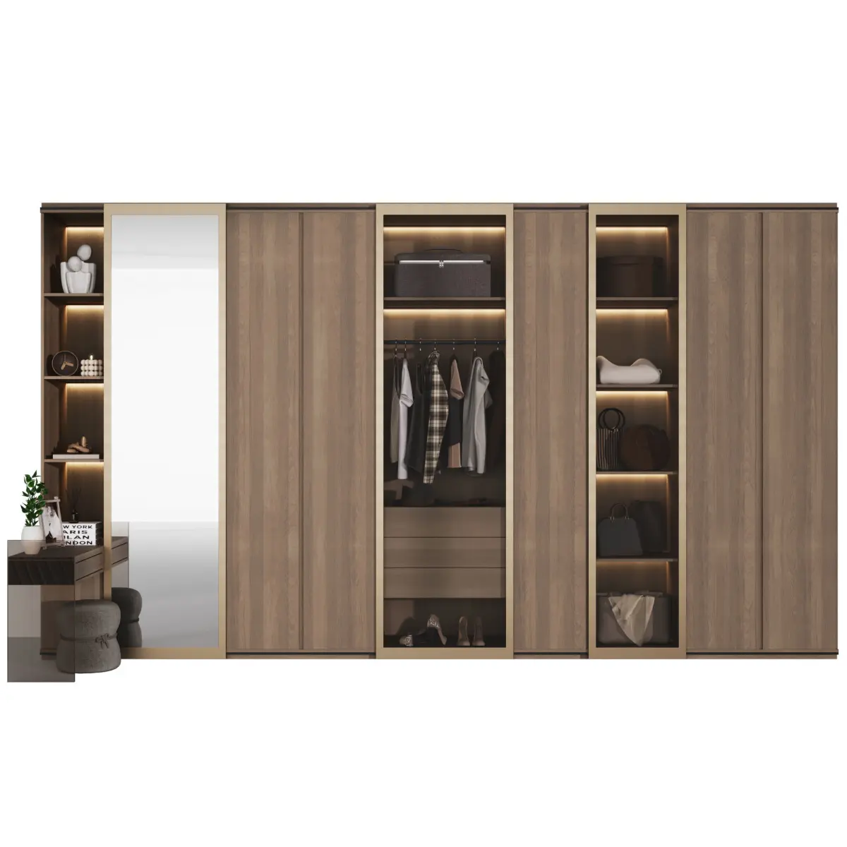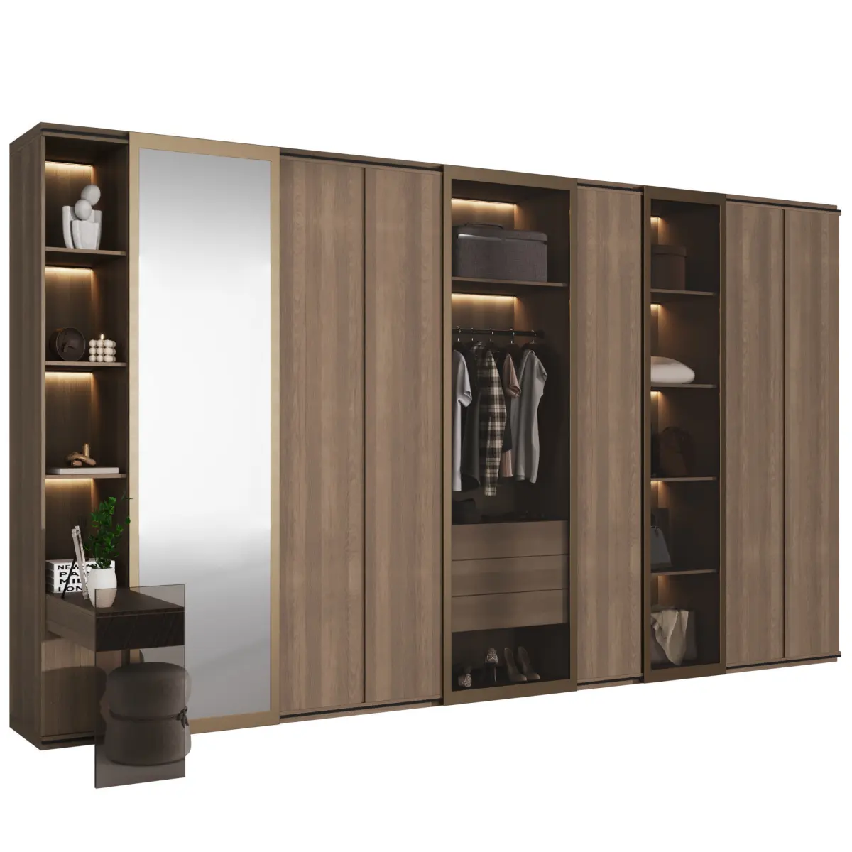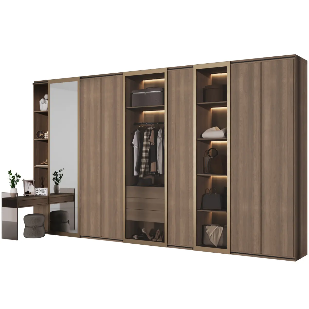 Dressing room in a modern L-shaped style with filling. The cabinet model consists of modules and is easy to edit. Part of the cabinet is covered with wooden facades, and the other part is covered with sliding doors made of glass and mirror. Also, the cabinet design has a makeup table with a glass leg and illuminated shelves for a variety of decor.