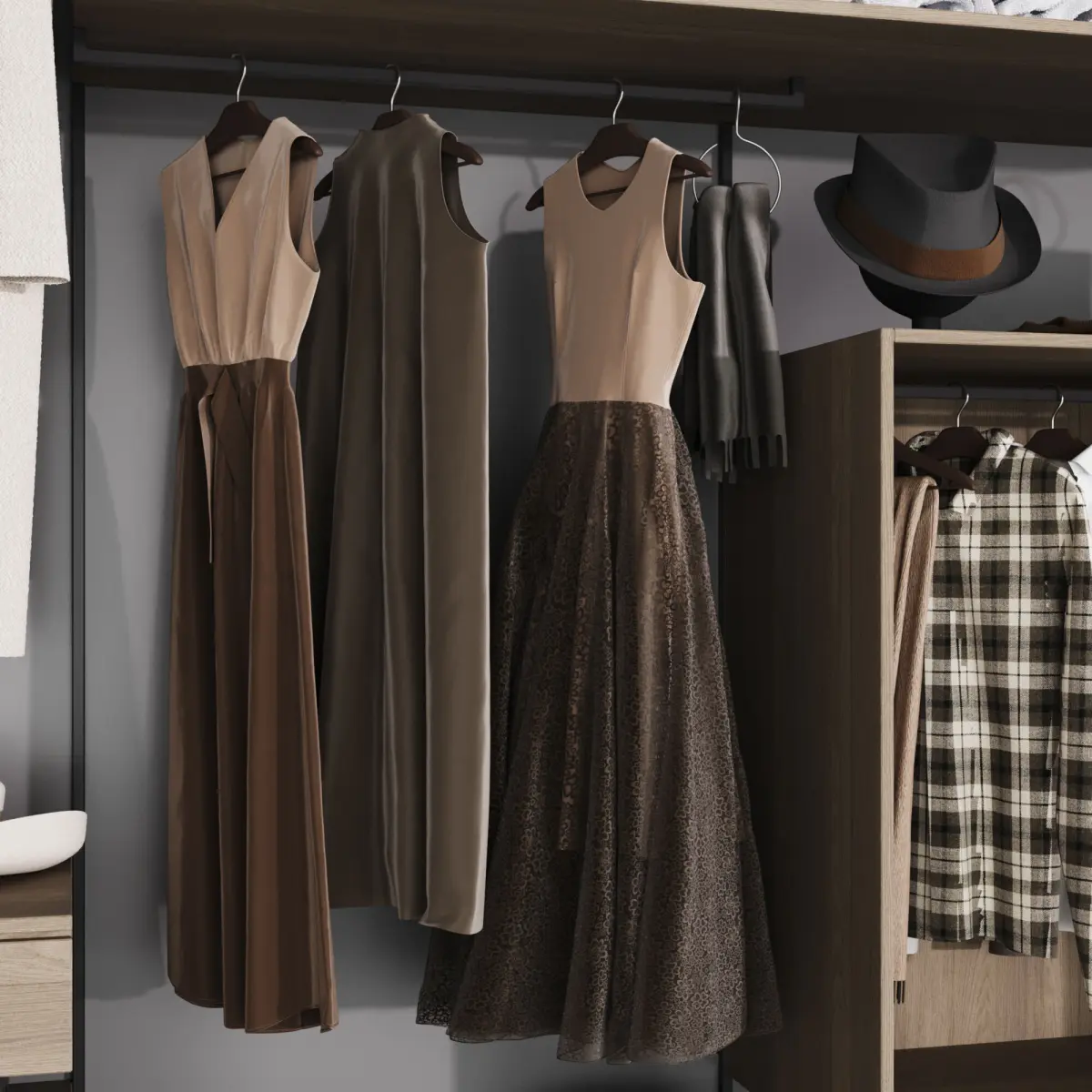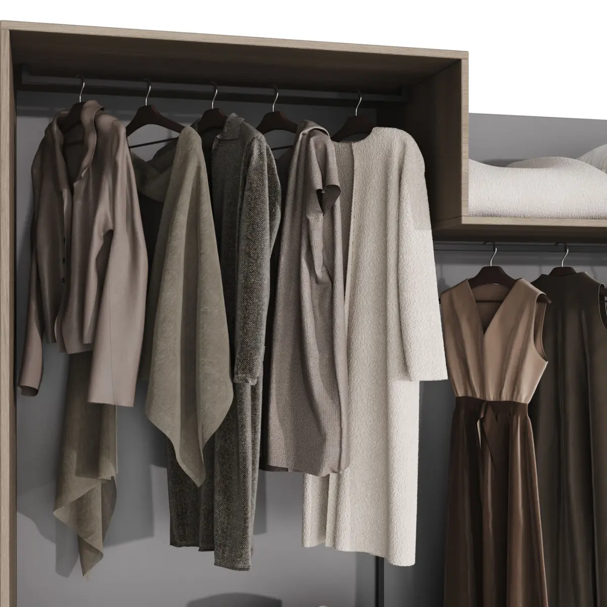 Straight wardrobe in a modern style with filling. The wardrobe model consists of modules and is easy to edit.