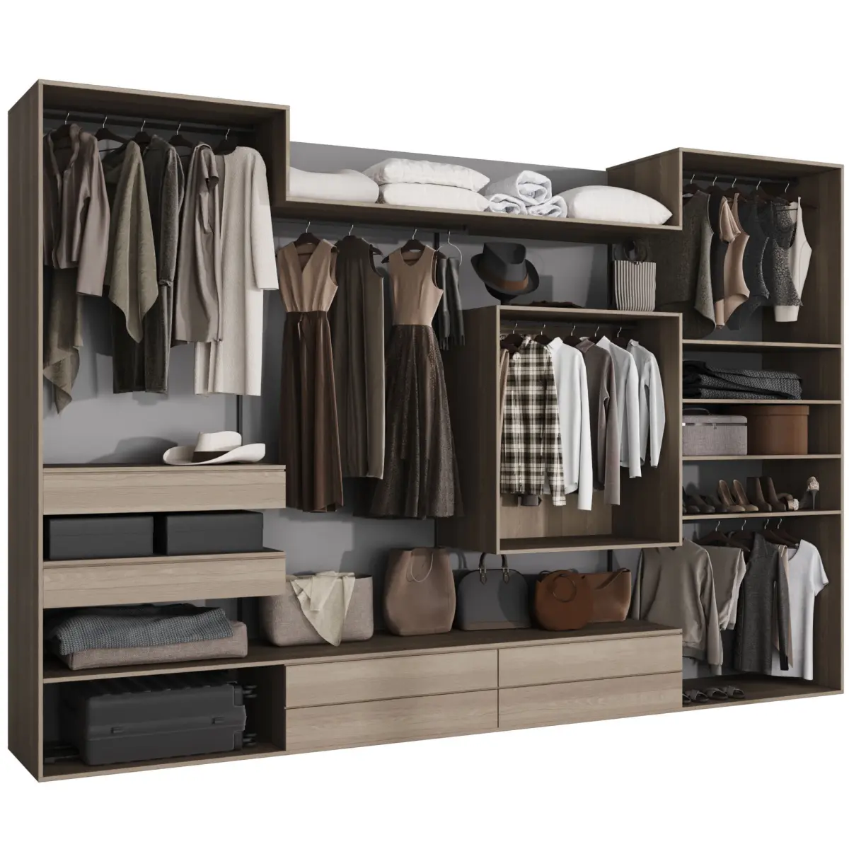 Гардероб прямой формы в современном стиле с наполнением. Модель шкафа состоит из модулей и легко редактируется.
