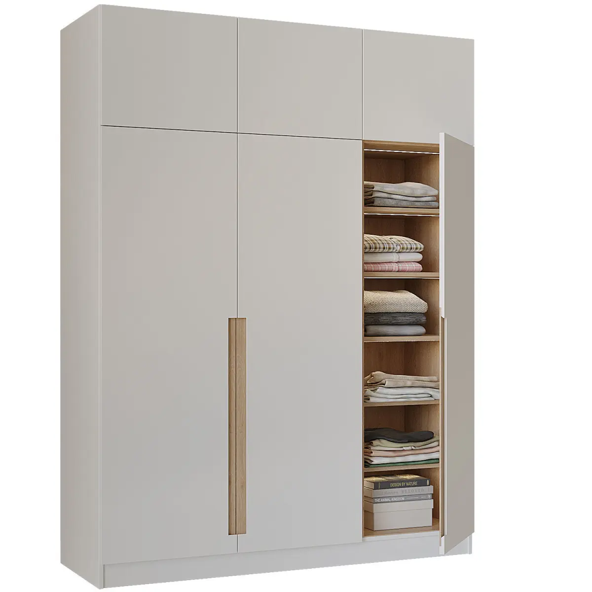 Wardrobe with integrated handle and set of clothes.There are two models in the file, with the door open and closed.The pivot point is set on the front and the hinge, you can open the door a little or close it a little.For near angles of clothing, you can turn on turbosmooth if you wish.
