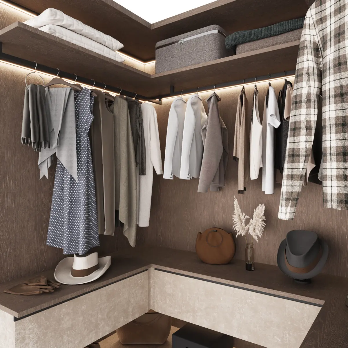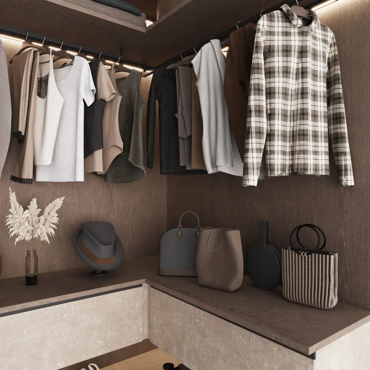 Wardrobe composition in a modern U-shaped style with filling. The cabinet model consists of modules and is easy to edit.