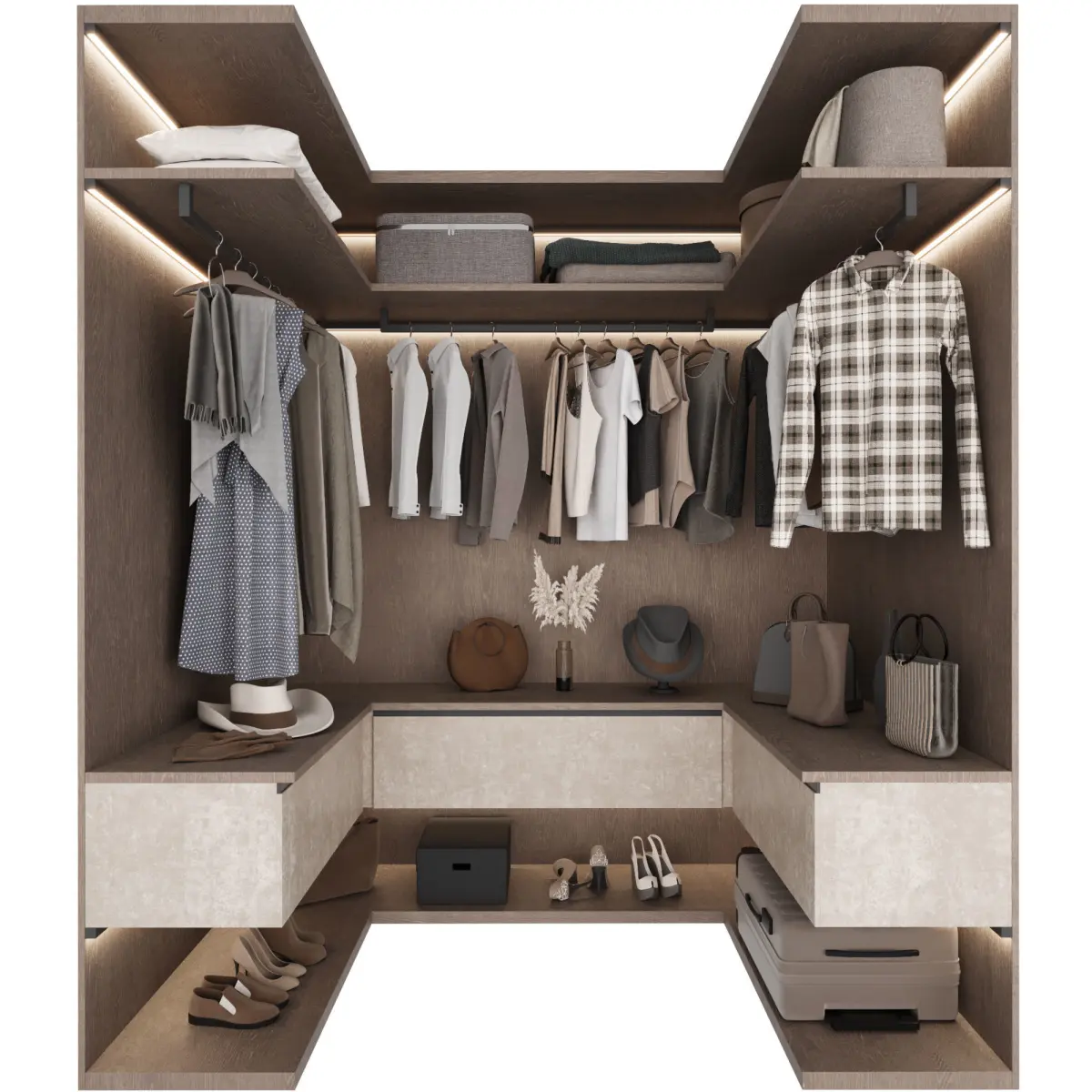 Гардеробная композиция в современном стиле П-образной формы с наполнением. Модель шкафа состоит из модулей и легко редактируется.