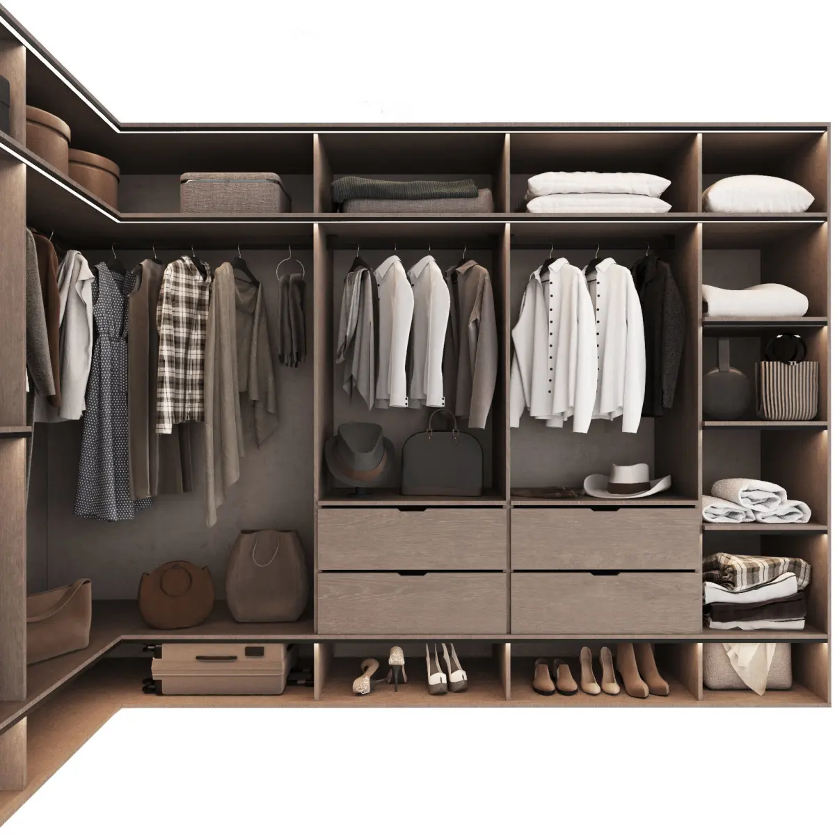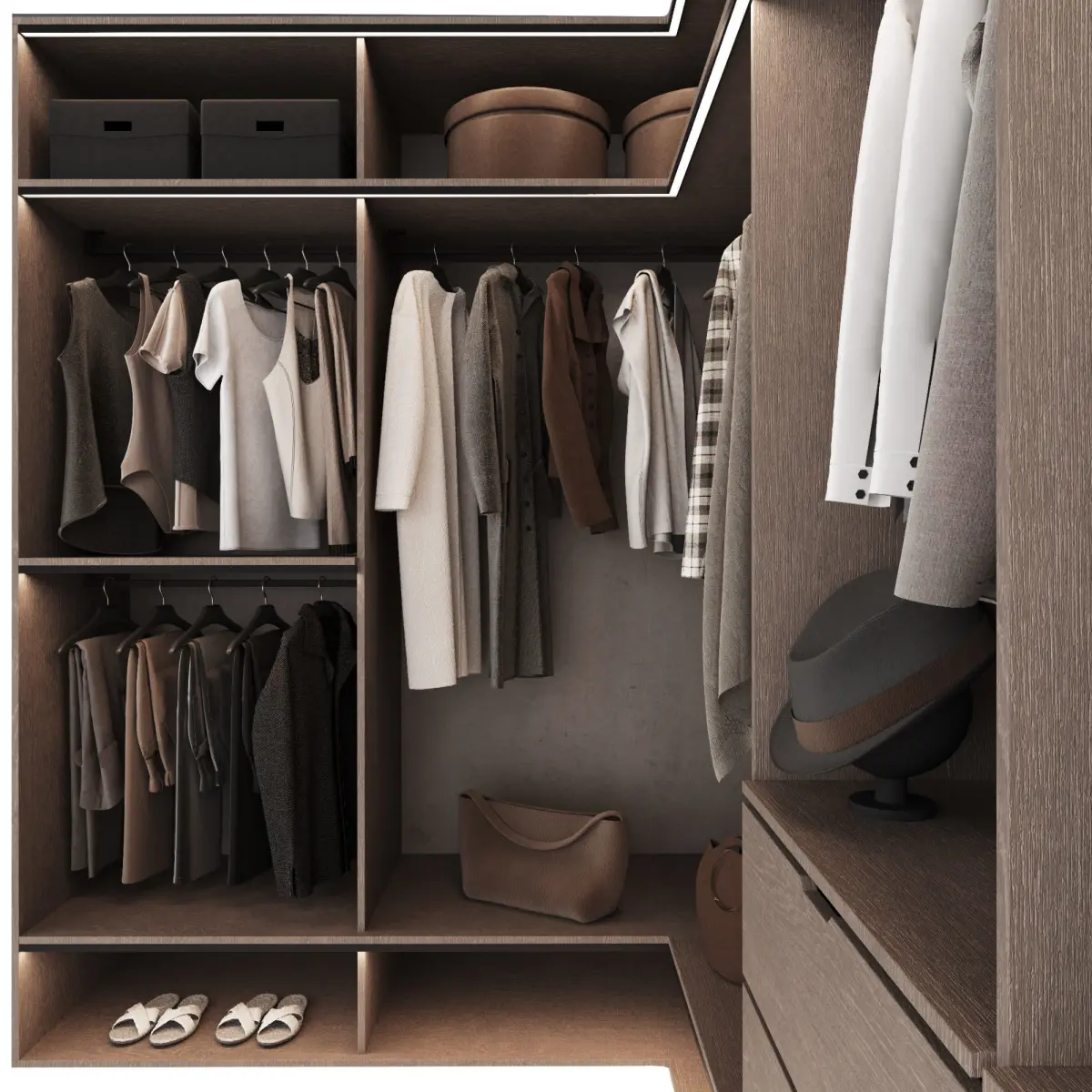 Wardrobe composition in a modern L-shaped style with filling. The cabinet model consists of modules and is easy to edit.
