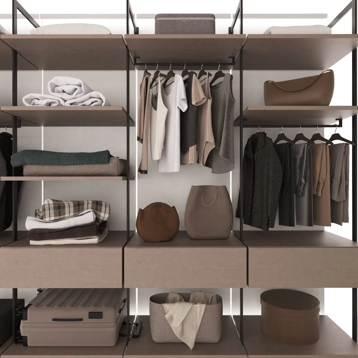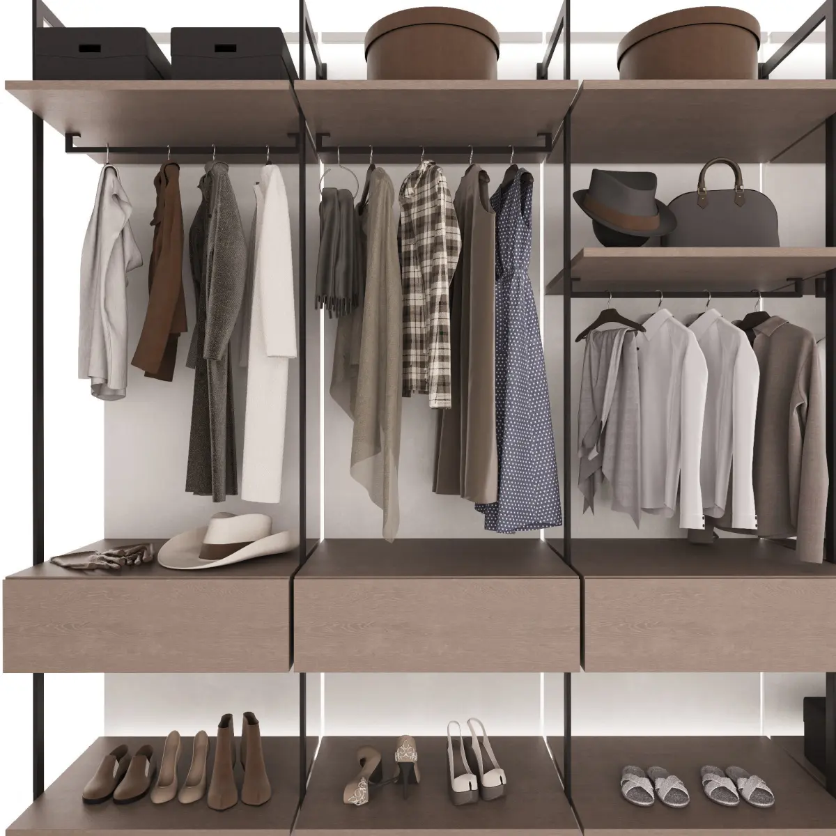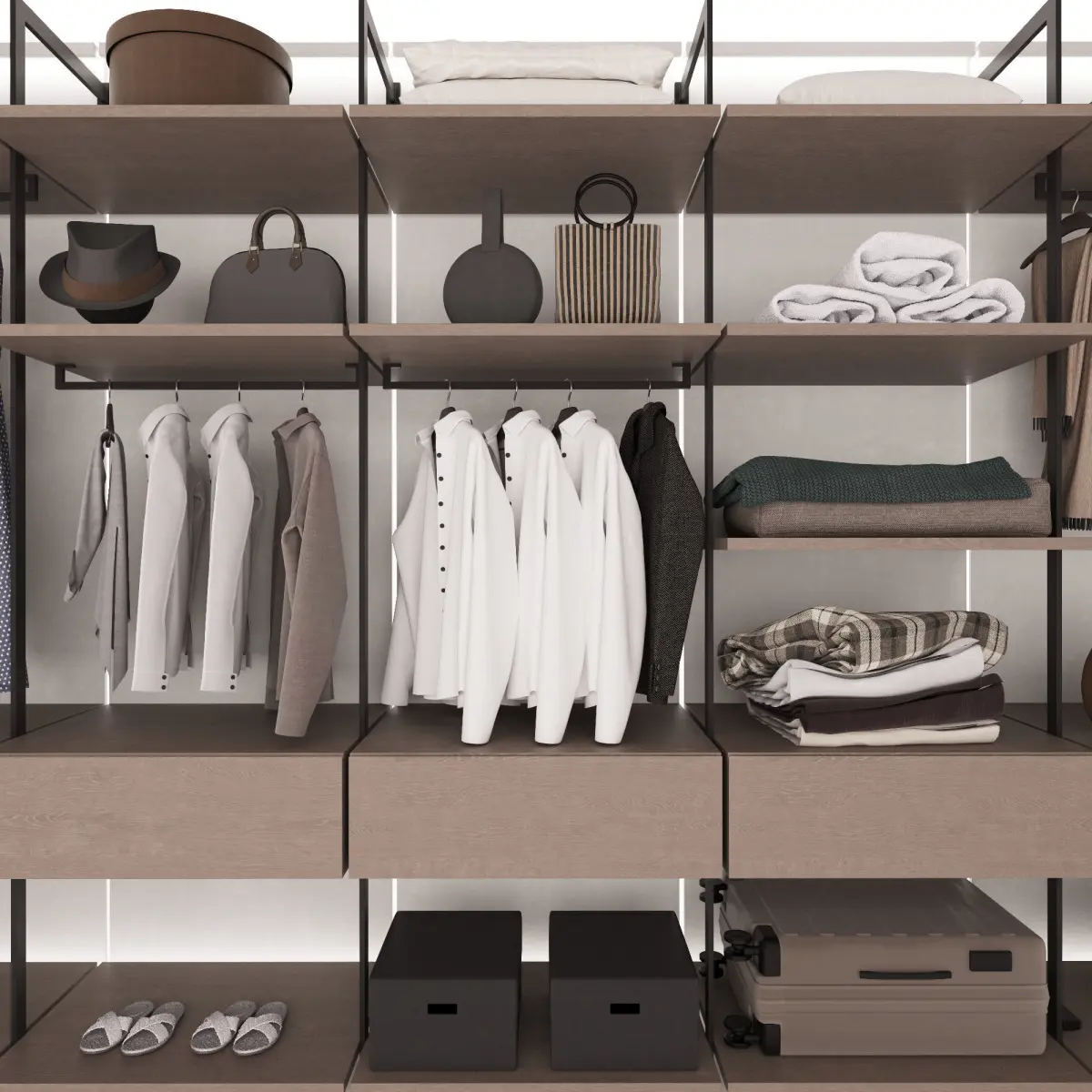 Гардеробная композиция в современном стиле прямой формы с наполнением. Модель шкафа состоит из модулей и легко редактируется.