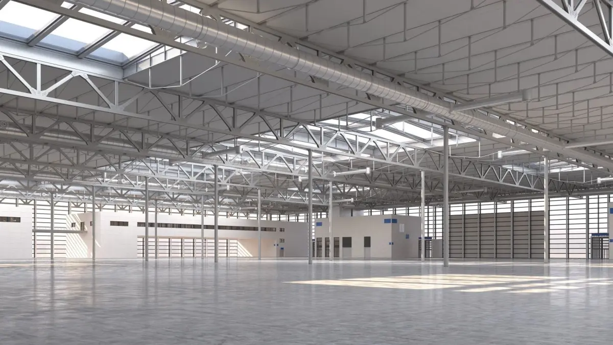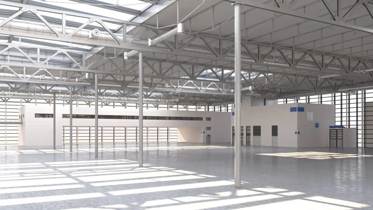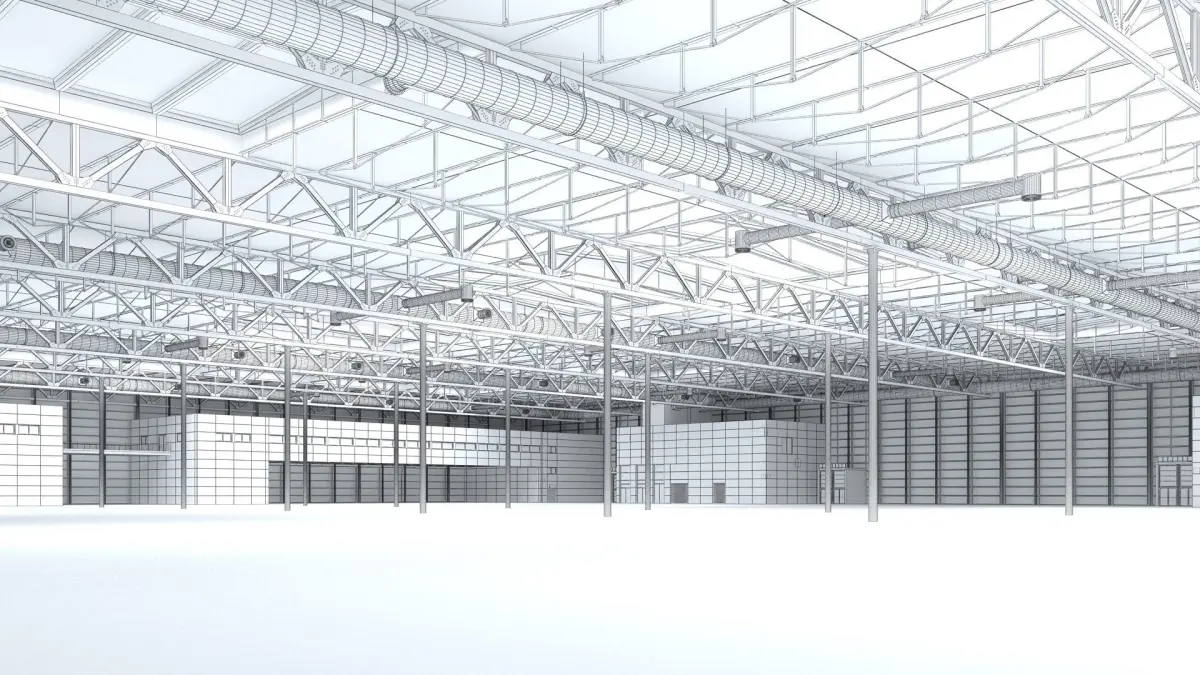 A highly detailed 3D model warehouse / industrial building space. This facility could represent either a warehouse, exhibition hall, airport terminal, processing facility or public transport concourse, for example.