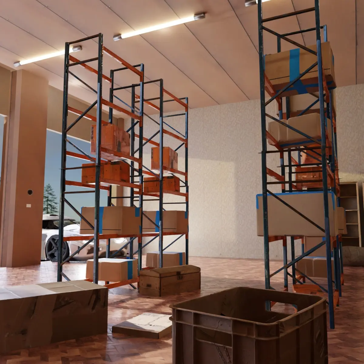 this product includes a bonus rigged koenigsegg car with auto-rolling wheels(tested on blender)a warehouse interior with boxes, barrels, cupboards, big boxes and small boxes, with high-quality and realistic textures and materials.