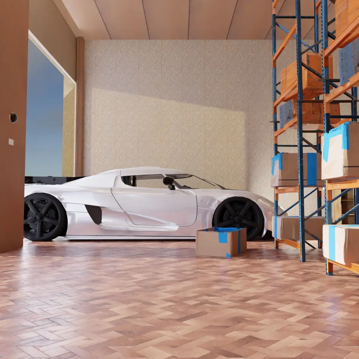 Warehouse interior full of boxes with Koenigsegg