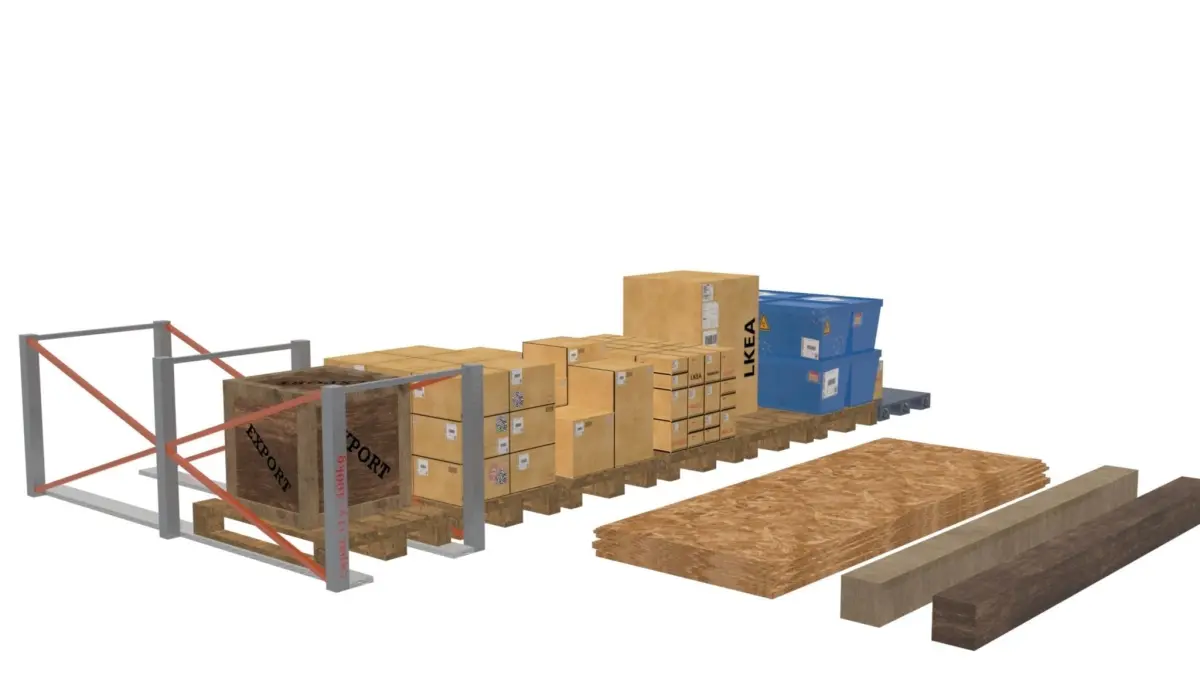 This modells can you find in the file:industrial shelf,wood palett, plastic pallet, 5 kind of carton boxes, 4 plastic box
