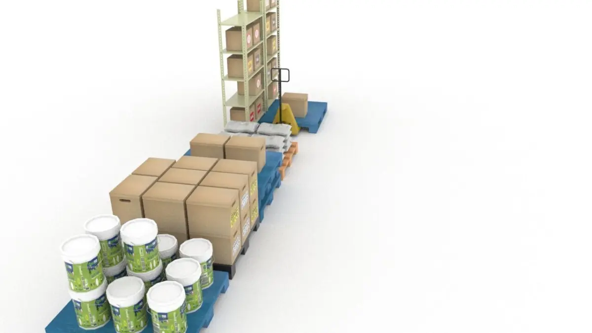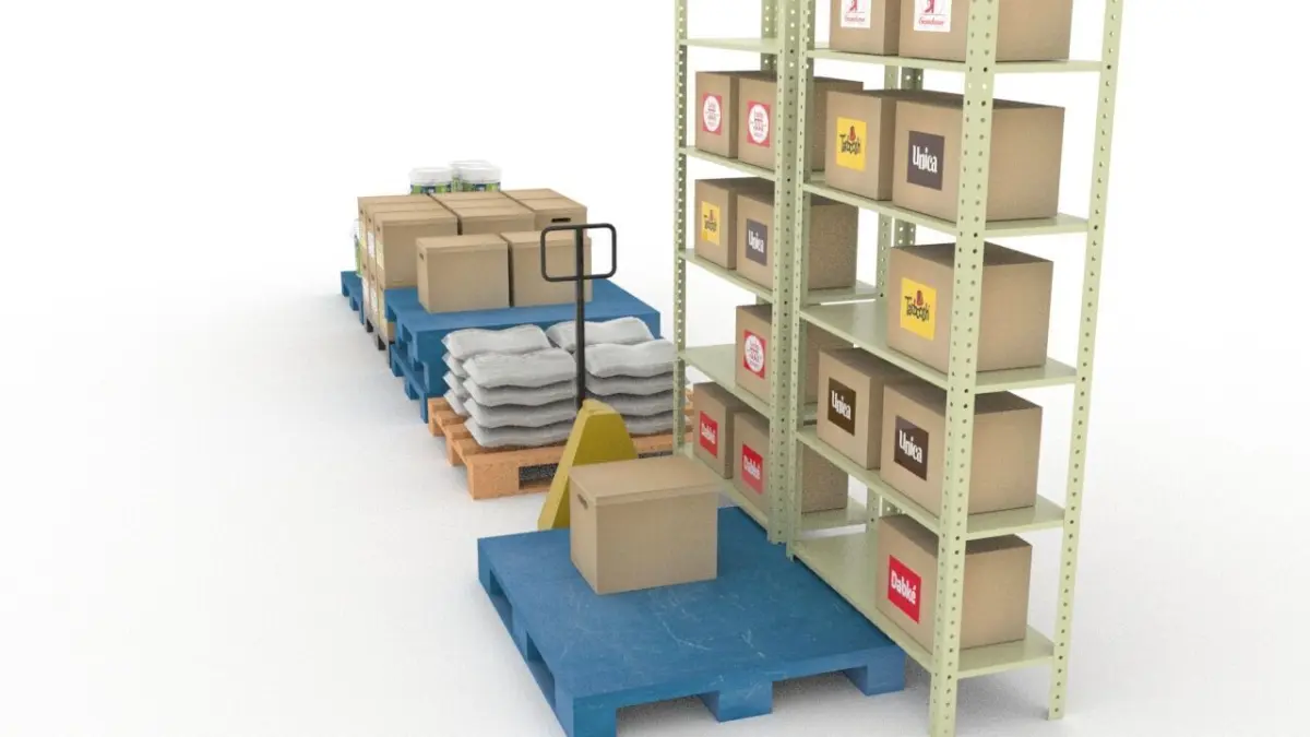 - Clean and organized warehouse storage scene featuring a variety of detailed elements ideal for logistics, industrial design, retail storage, or game environment visualization.