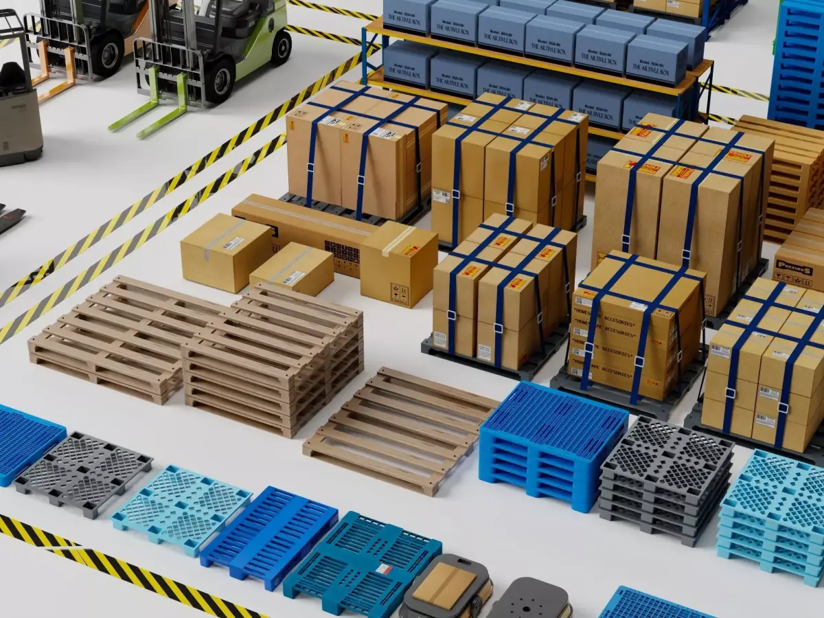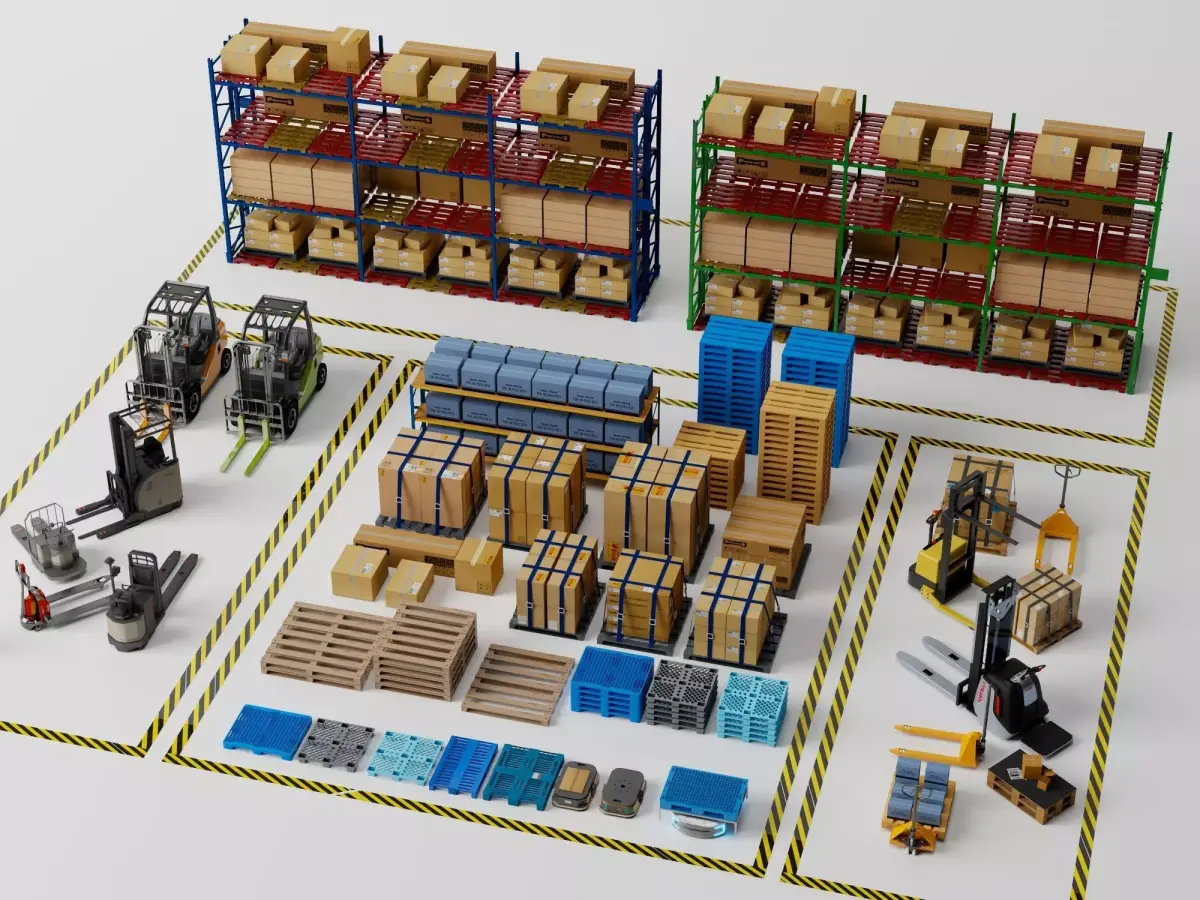 High-quality pack of modern warehouse storage and logistics interior 3D models, featuring: tall blue/green/red metal pallet racks with multi-level stacking, cardboard boxes on wooden pallets (branded labels), forklifts and manual pallet jacks, safety yellow floor markings, overhead fluorescent lighting, concrete floor, support columns, and detailed industrial storage props.Models built to real-world scale with high detail — accurate rack beams/welds, corrugated box textures, wooden pallet grain, metal rust/weathering, rubber wheel grip, subtle dirt/grime, and authentic high-bay warehouse realism.Full PBR workflow with high-res textures (2K-4K): Albedo, Roughness, Metallic, Normal, AO maps for realistic metal reflections, cardboard surface variation, and depth in any lighting.Ideal for:• Architectural visualization and warehouse renders• Logistics center, distribution hub, and storage facility builds• Industrial/e-commerce supply chain scenes• Game assets (Unity/Unreal ready)• VR/AR warehouse tours and operations simulations• VFX, promotional videos, facility planningOptimized polycount for real-time — drag and drop to enhance scenes instantly.Compatible formats:MAX (with materials), OBJ, FBXCompatible with 3ds Max, Maya, Blender, Cinema 4D, Unity, Unreal Engine, and more.