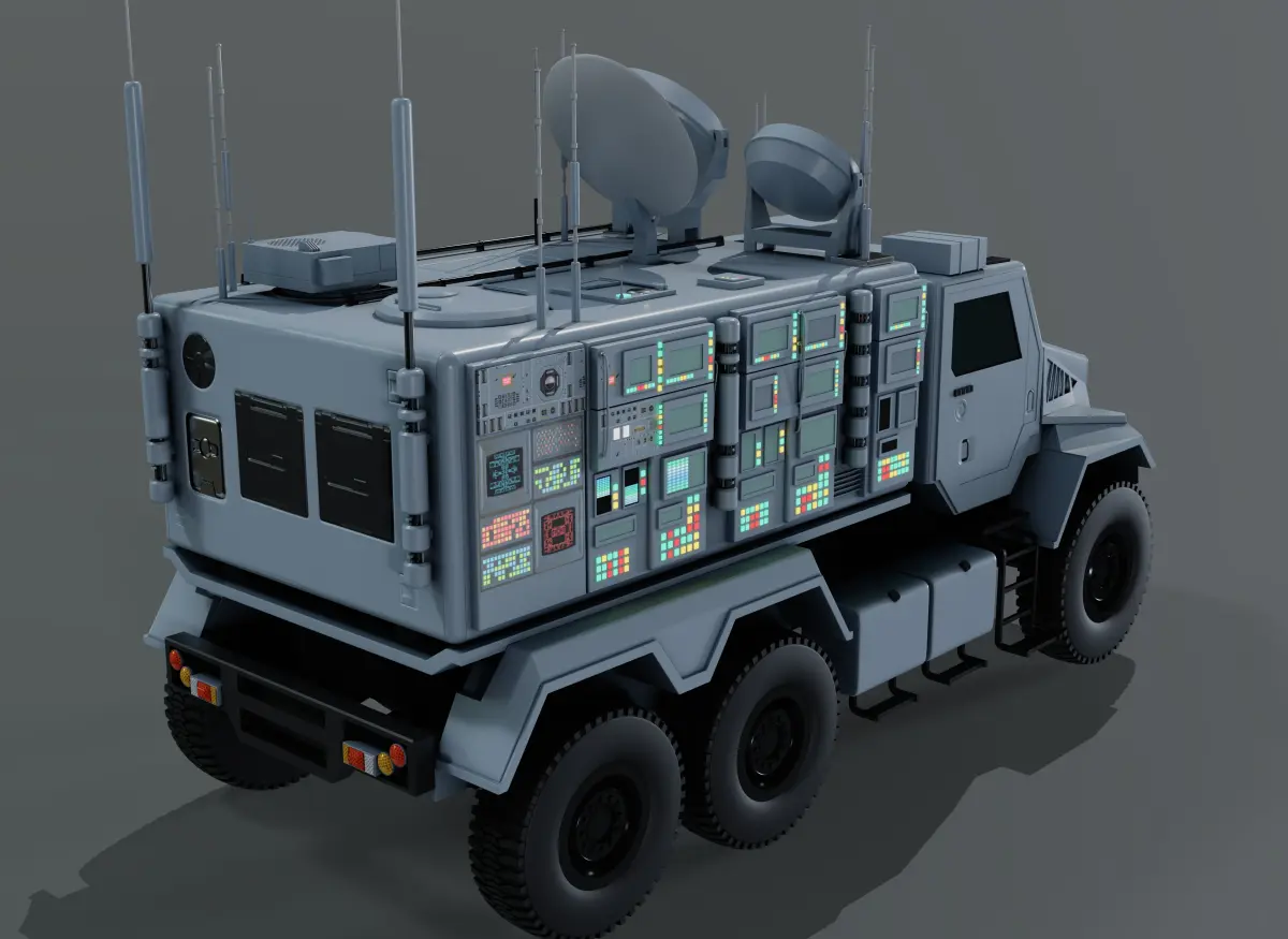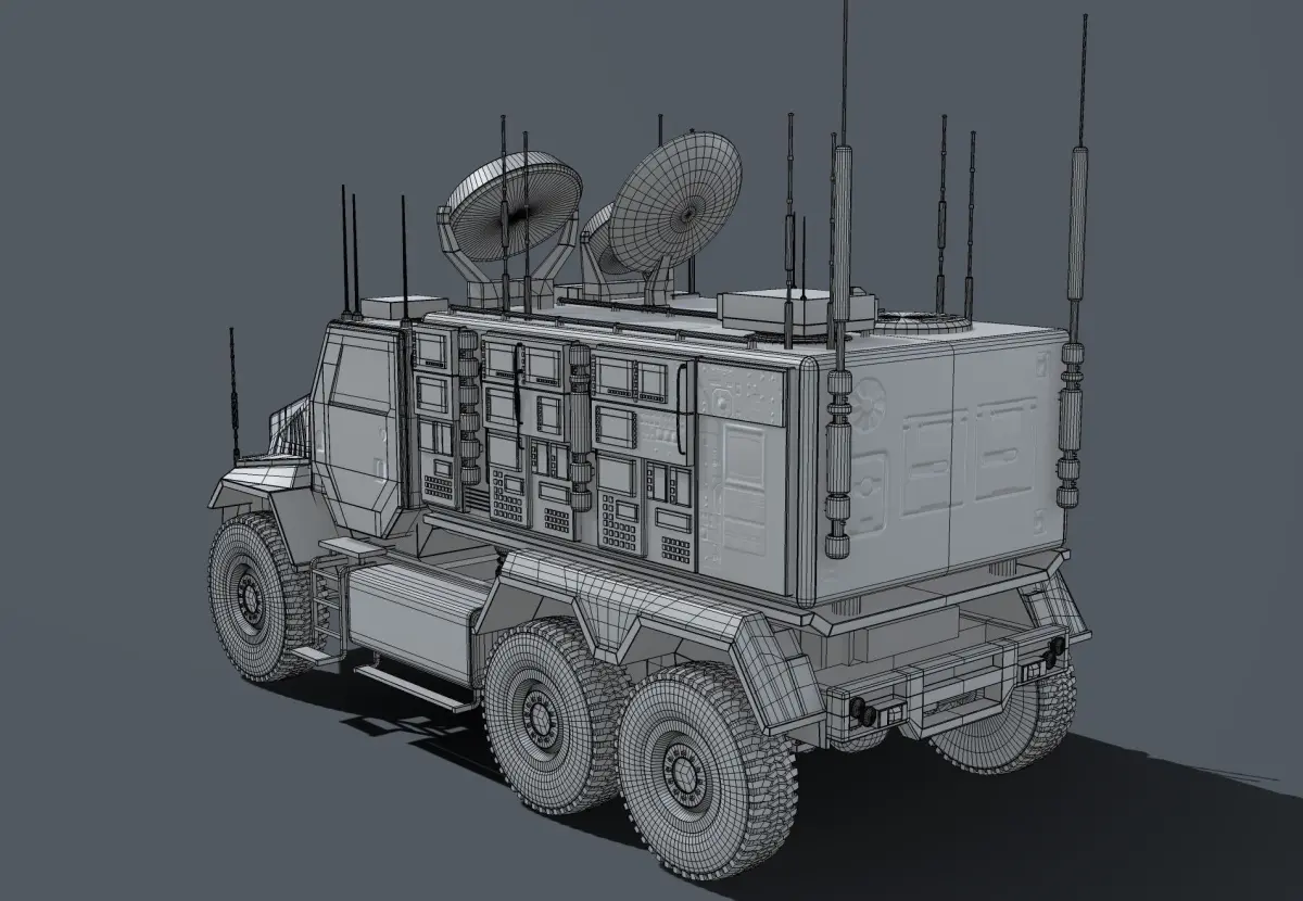 An electronic warfare vehicle in a digital camouflage pattern, with a rugged and utilitarian appearance, showcasing a variety of antennas and sensor arrays, built for stealth operations and counter-surveillance missions in contemporary military settings.