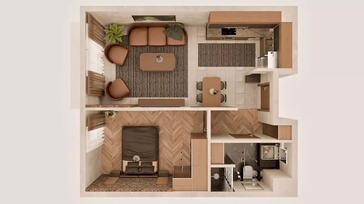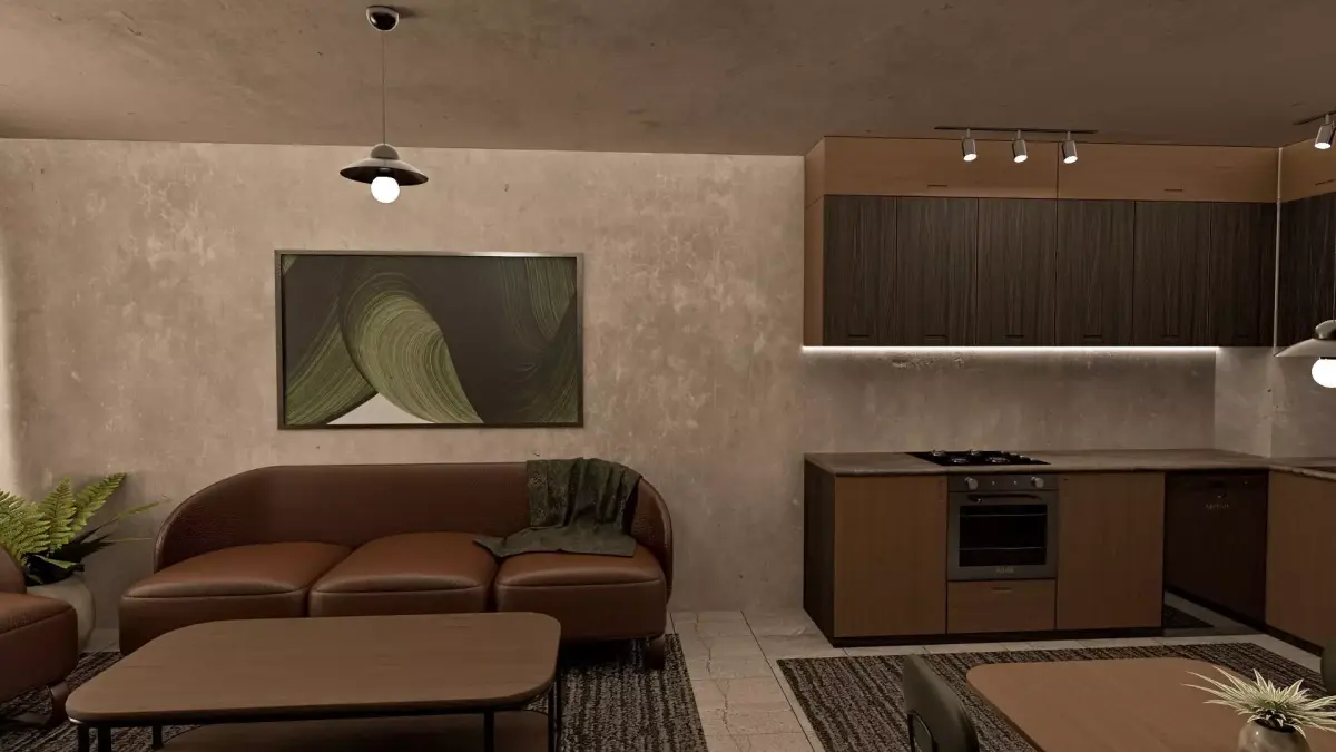 Warm Modern 1+1 apartment interior scene created in Blender with realistic materials and cozy lighting.Includes Blender file (.blend) + AutoCAD floor plan (.dwg) + PDF plan sheet (.pdf).