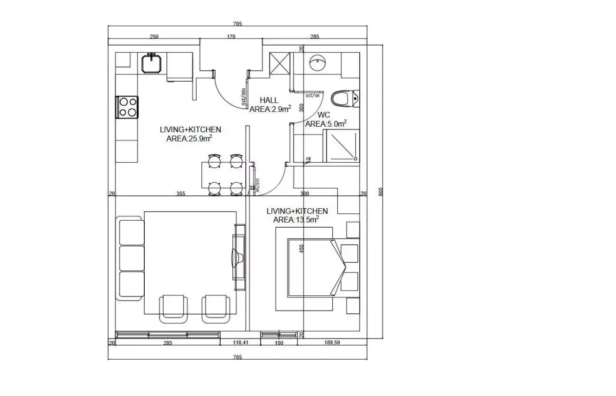 - Living room + open kitchen, bedroom, bathroom, entrance