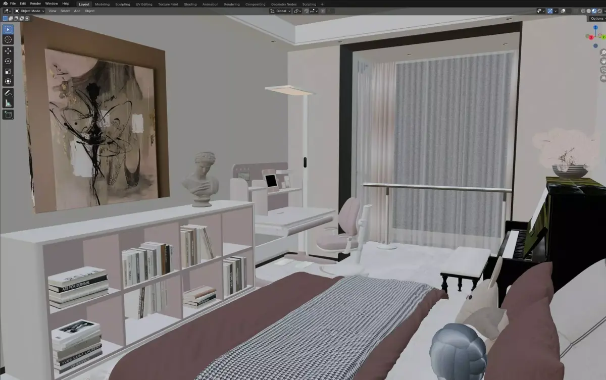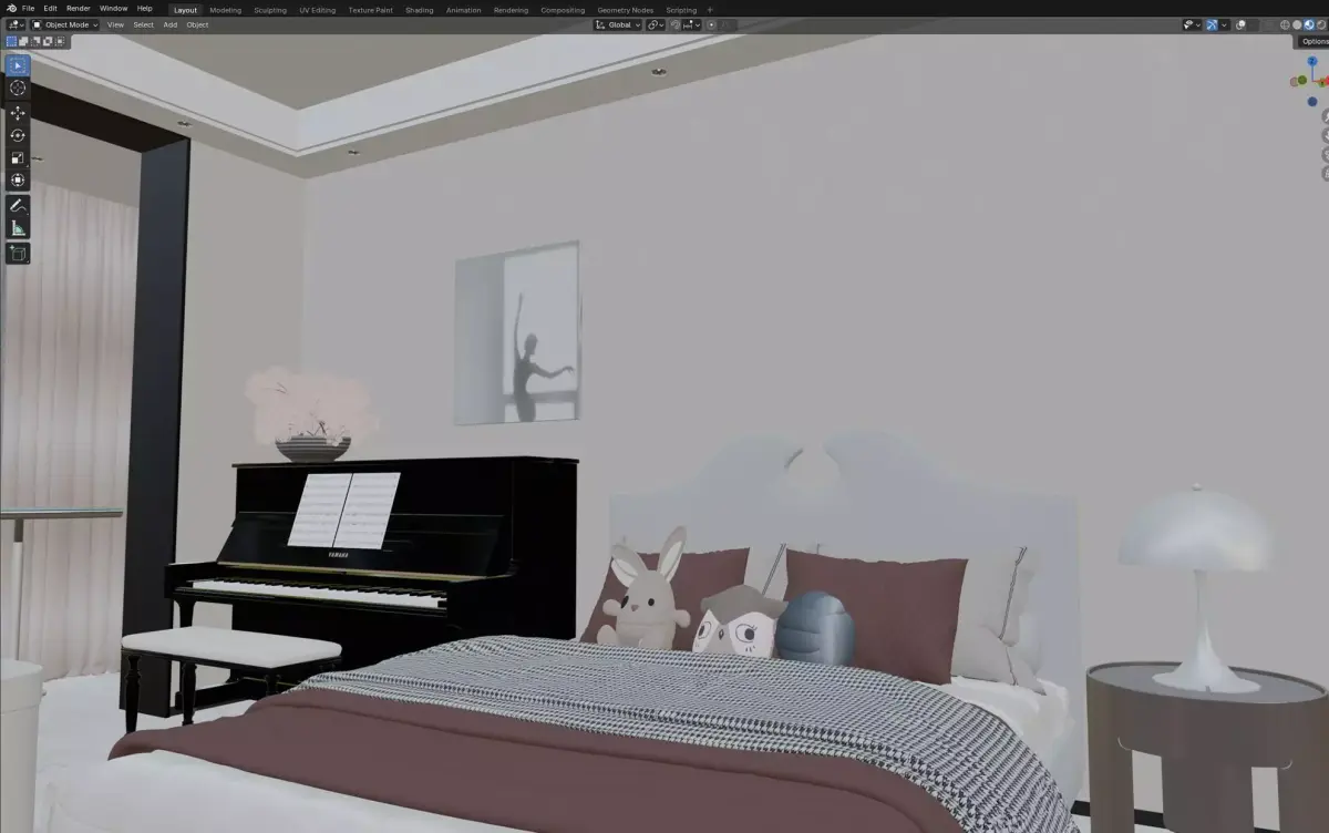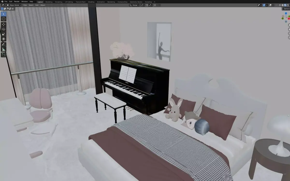 Warm Modern Bedroom with Study Desk and Piano 3D model