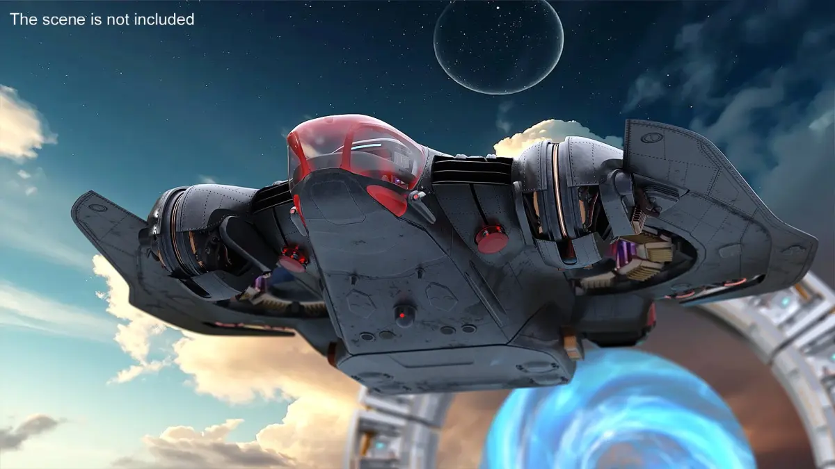 This model includes a high-tech assault shuttle with an aerodynamic stealth body labeled “Dark Star,” and a massive circular warp gate emitting a swirling blue energy vortex. The shuttle is equipped with dual propulsion systems, mounted artillery, and detailed cockpit instrumentation. Fully animated and rigged, it’s optimized for both cinematic sequences and real-time simulations.