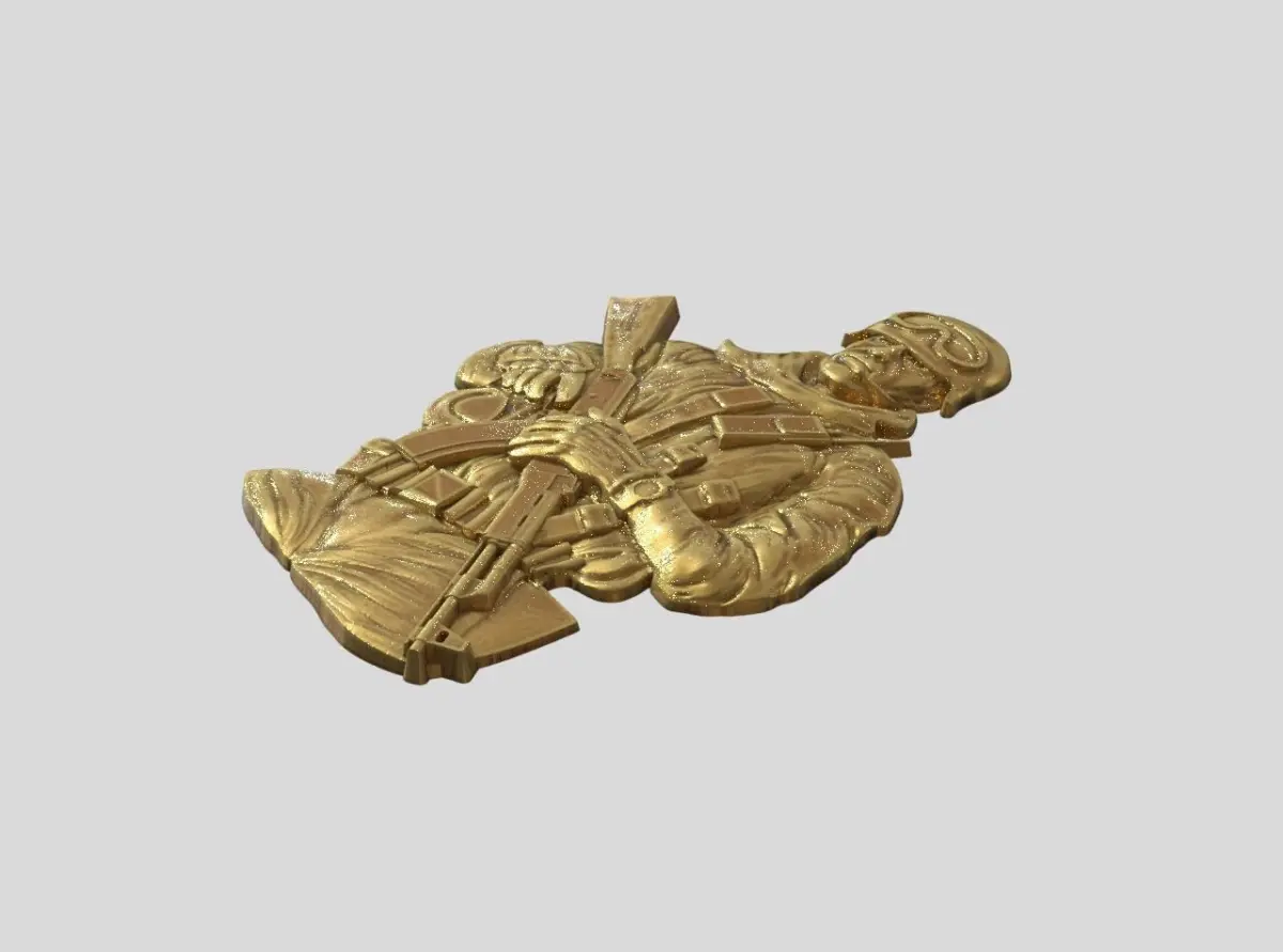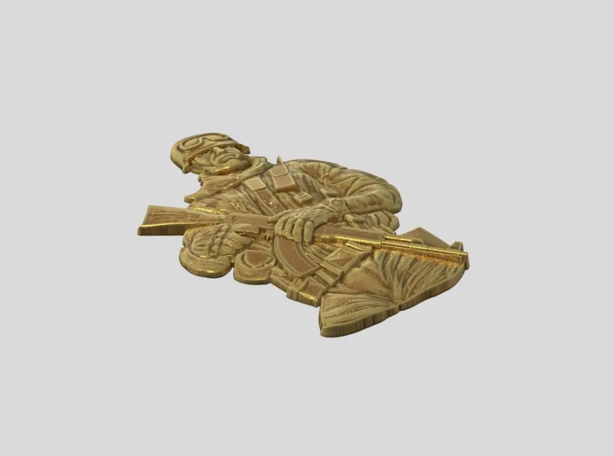 Warrior in combat gear and with an AK-47 assault rifle for coins, medals, orders, badges and more. Model size 28x18.8x1.5mm