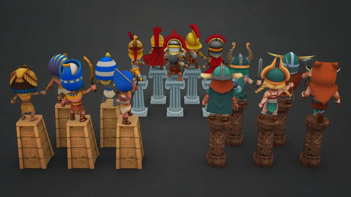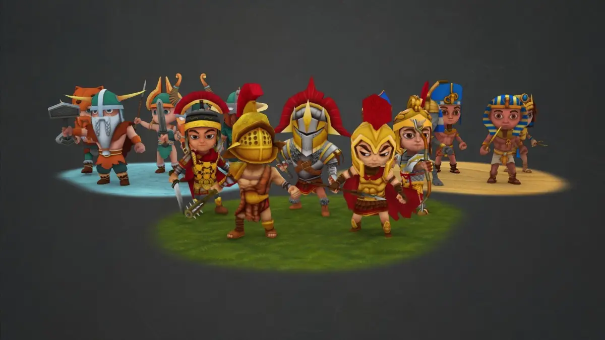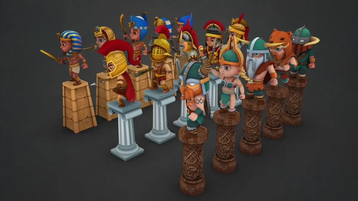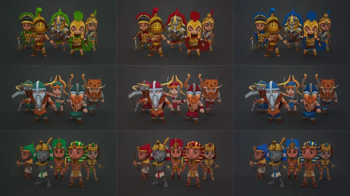 Game-ready low poly characters. Textured, rigged, and animated.+15 weapons that can be detached and attached.-5 Vikings-5 Romans-5 EgyptiansThe 15 models come in 3 colors, so you can easily set up different teams.They have simple humanoid rigs, that can implement Mixamo's animations.There is basically one texture (2048*2048) for each of the characters.